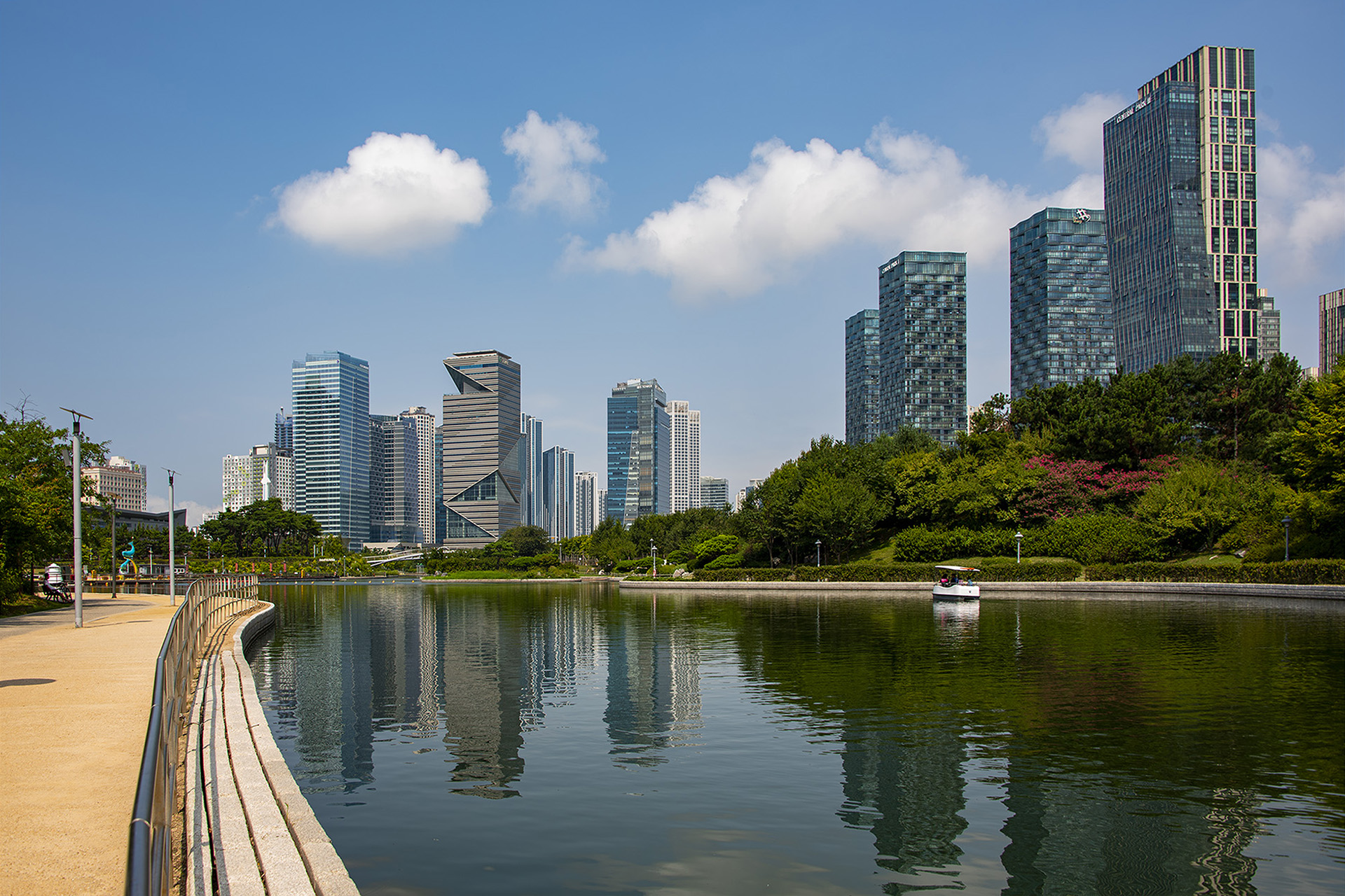 무덥지만 가을색이 짙은 어느 여름날 고운 구름이 있고 물에비친 빌딩의 그림자도 멋진모습으로 맞아주었다. -센트럴파크_