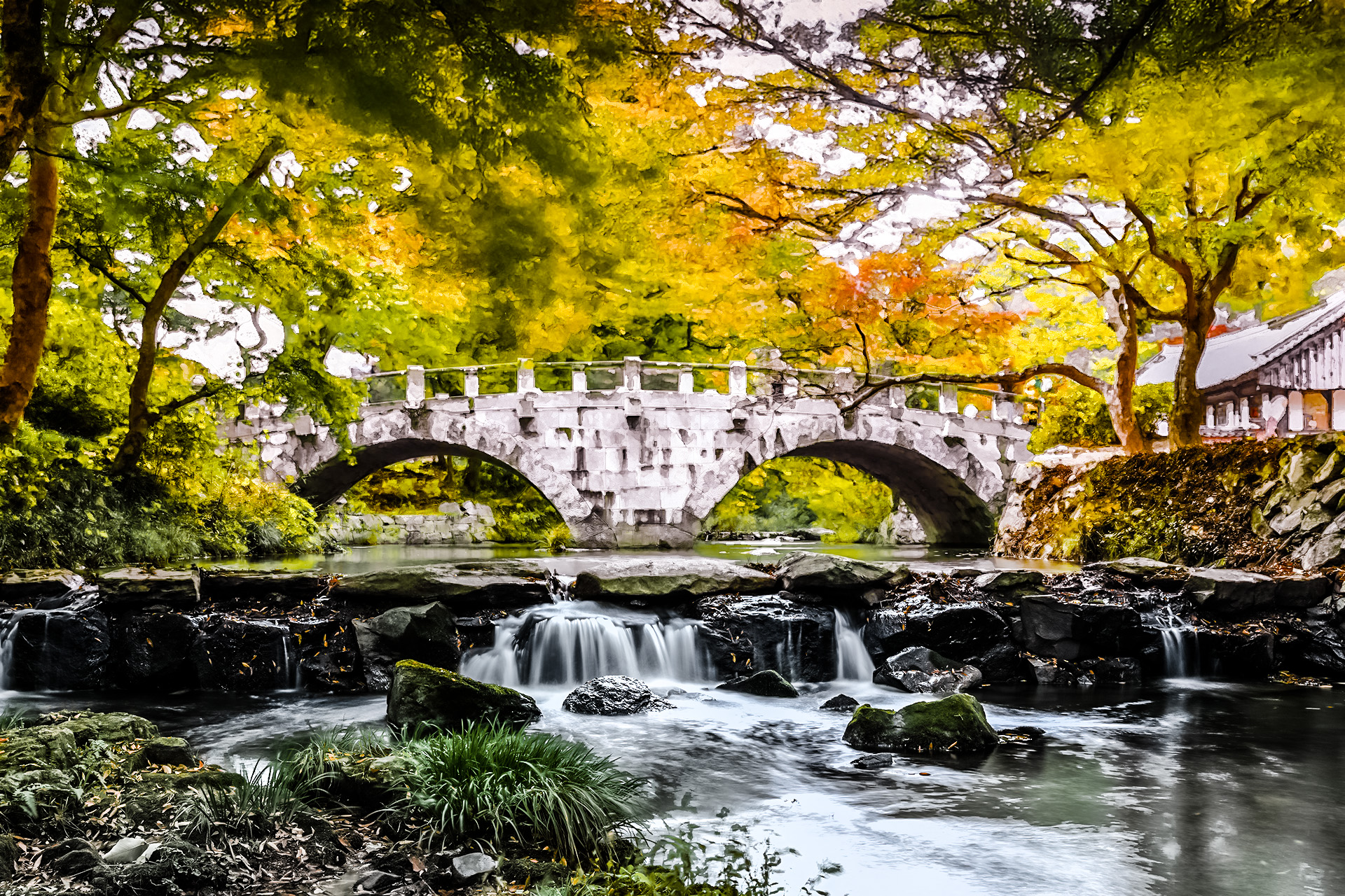 붉고 노란 단풍잎이 다리 계곡사이로