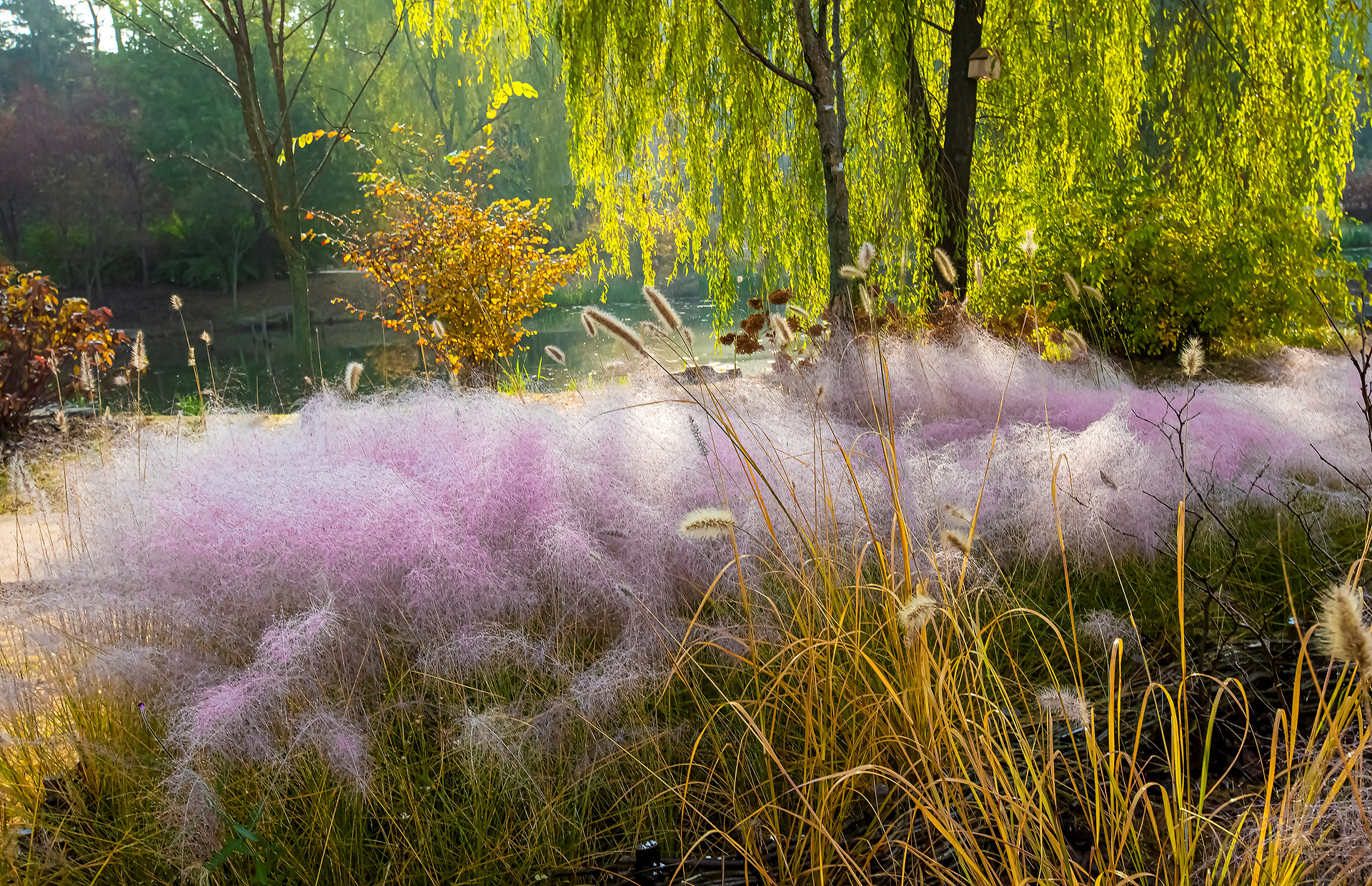 수양버들과 핑크물리 연희공원에서..
