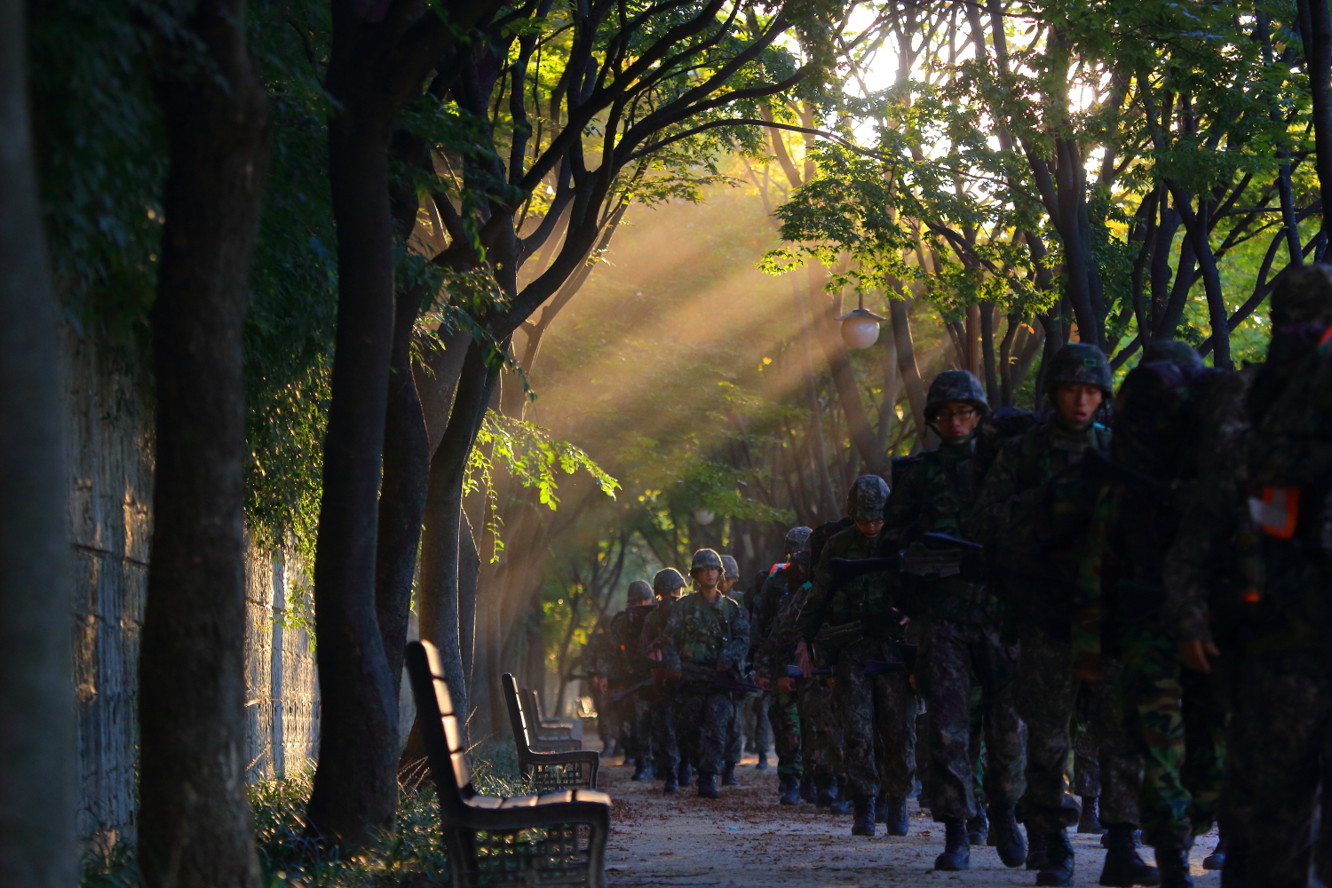 벤치 옆을 행군하고 있으며 그녀에 향기를 느끼는것