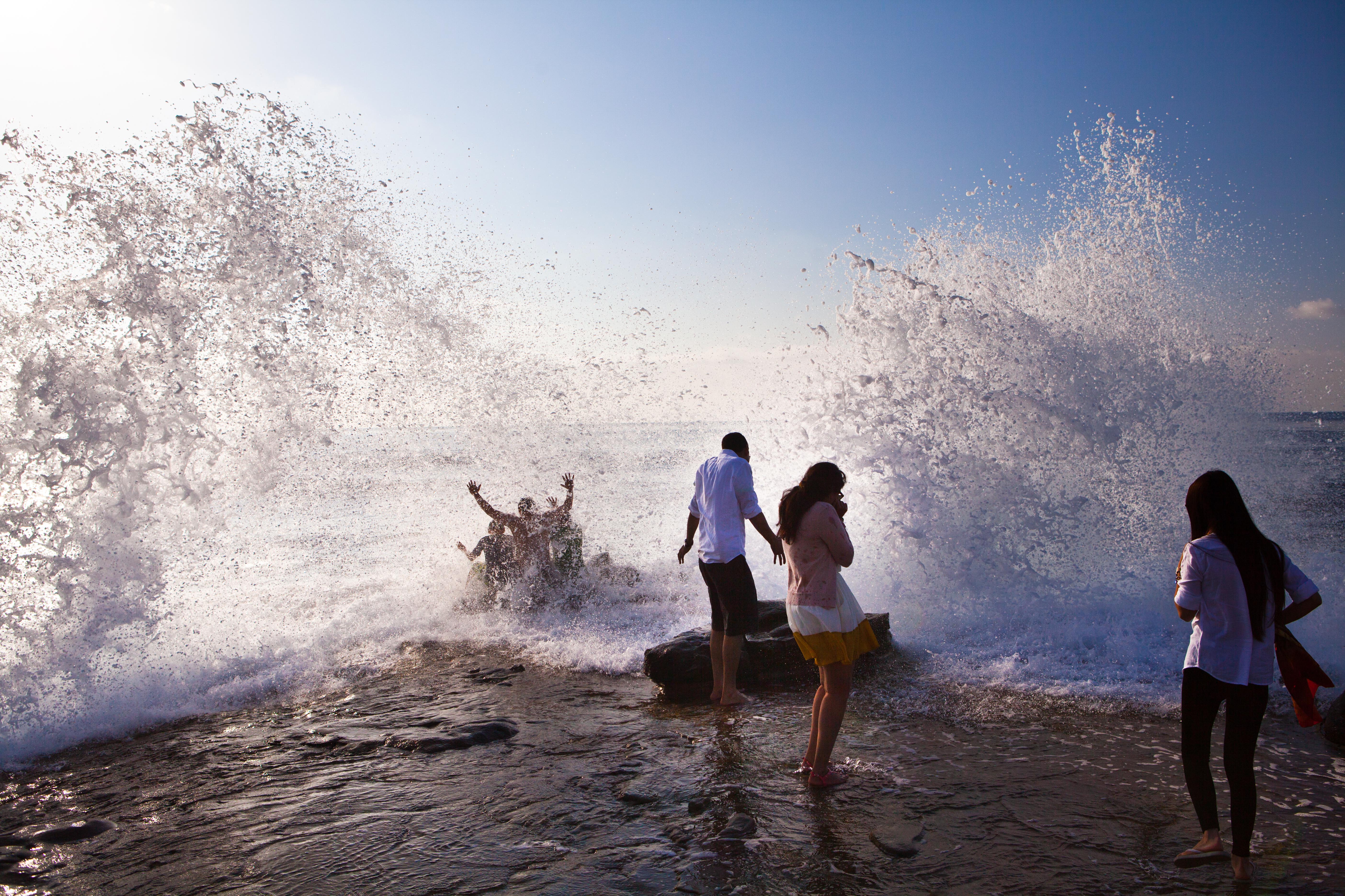 갑자기 닥쳐온 파도에 물벼락에 놀라는 광관객.