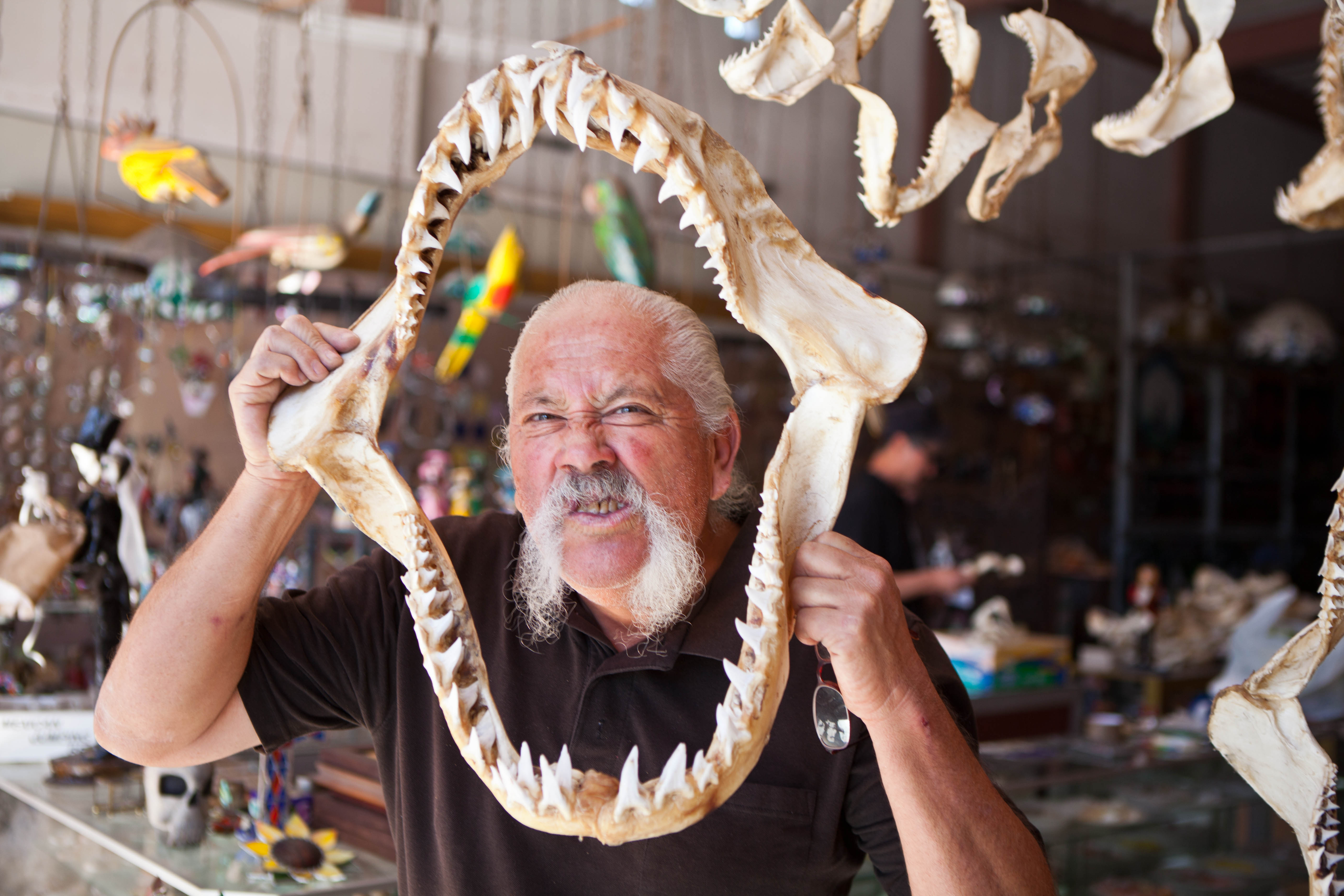 맥시코 선물점에 주인이 손님을 위해 익살을 부리고 있다..