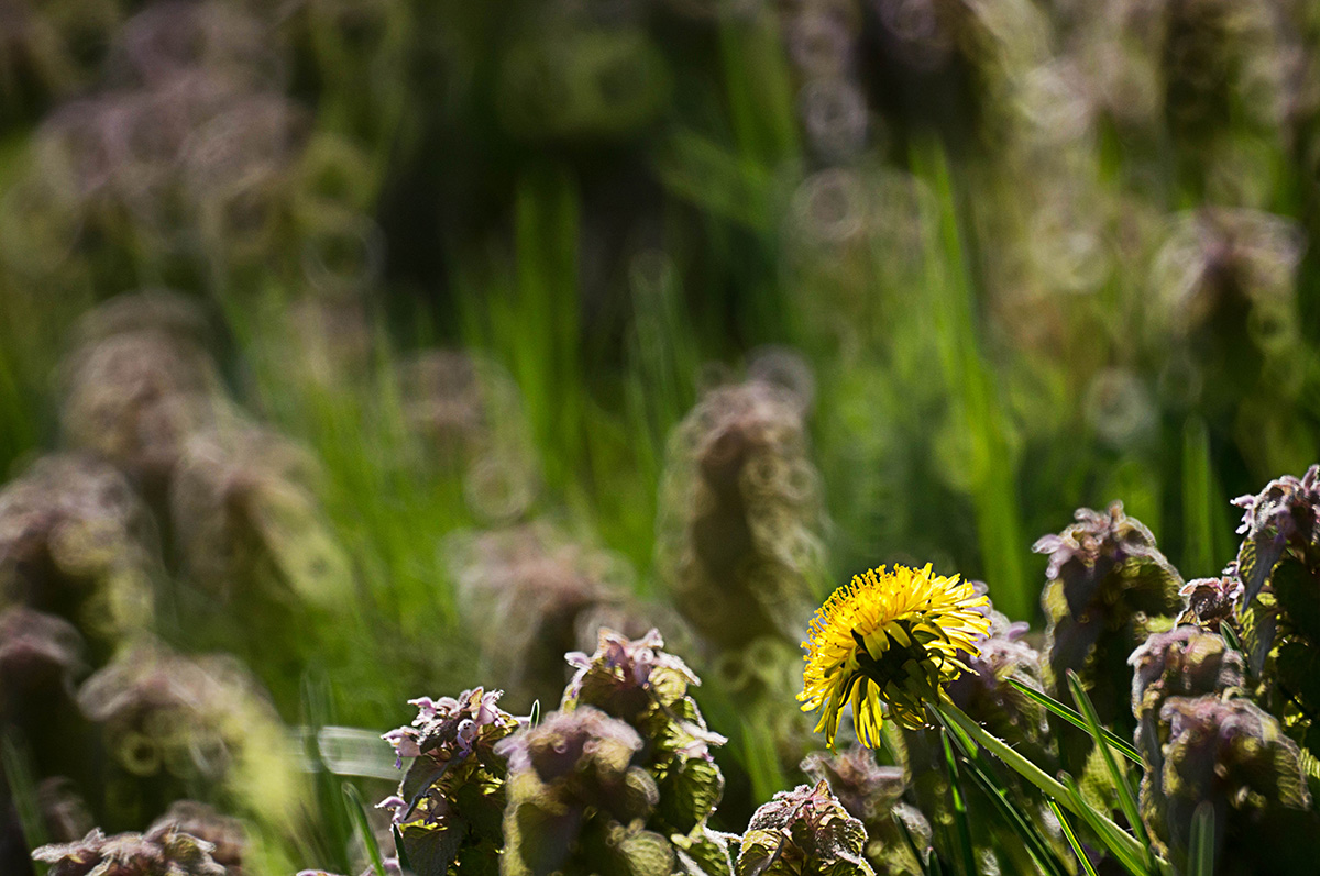 붉은 광대풀속에 홀로 피어난 민들레.