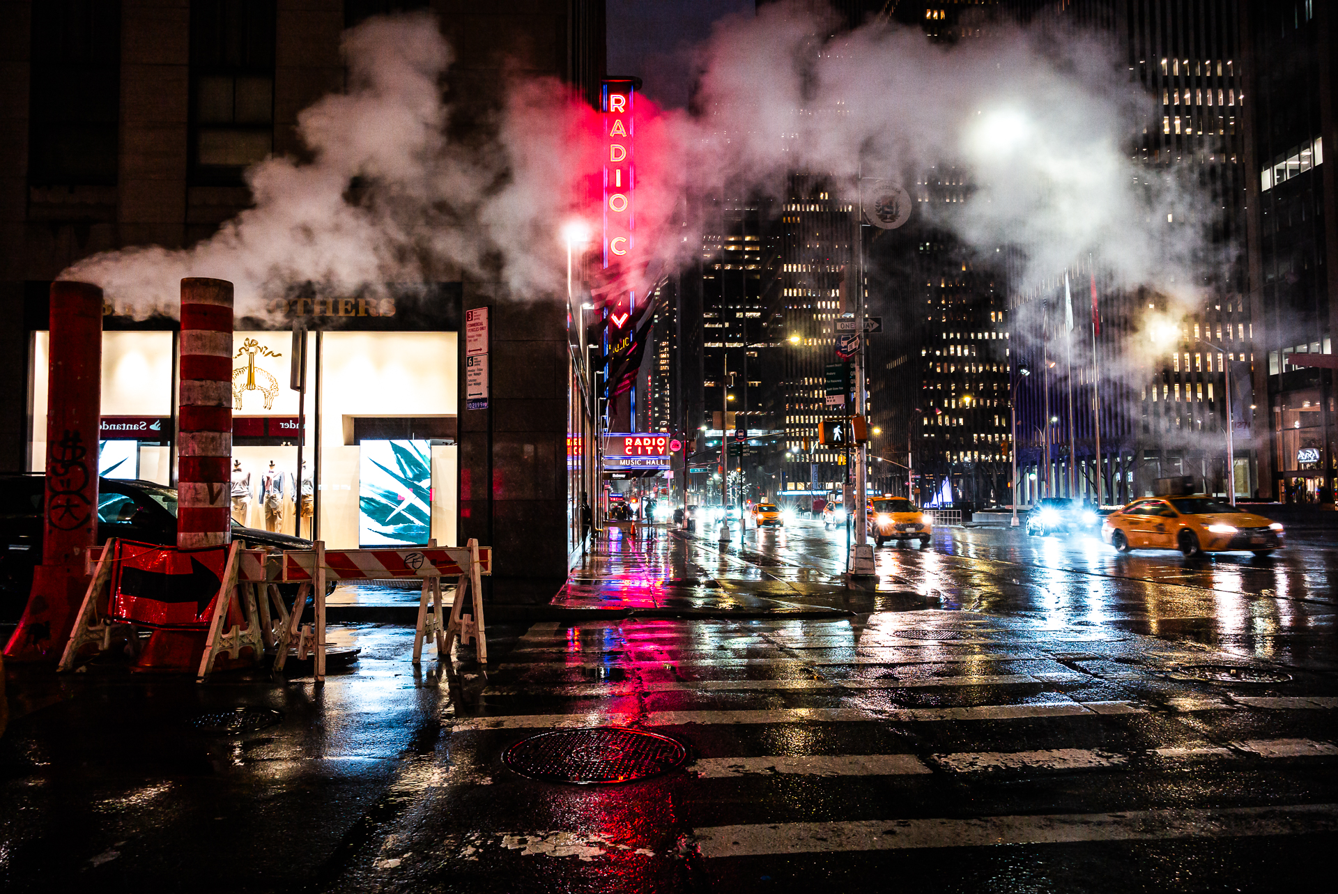비가 내리는 맨해튼 시내의 밤 풍경입니다