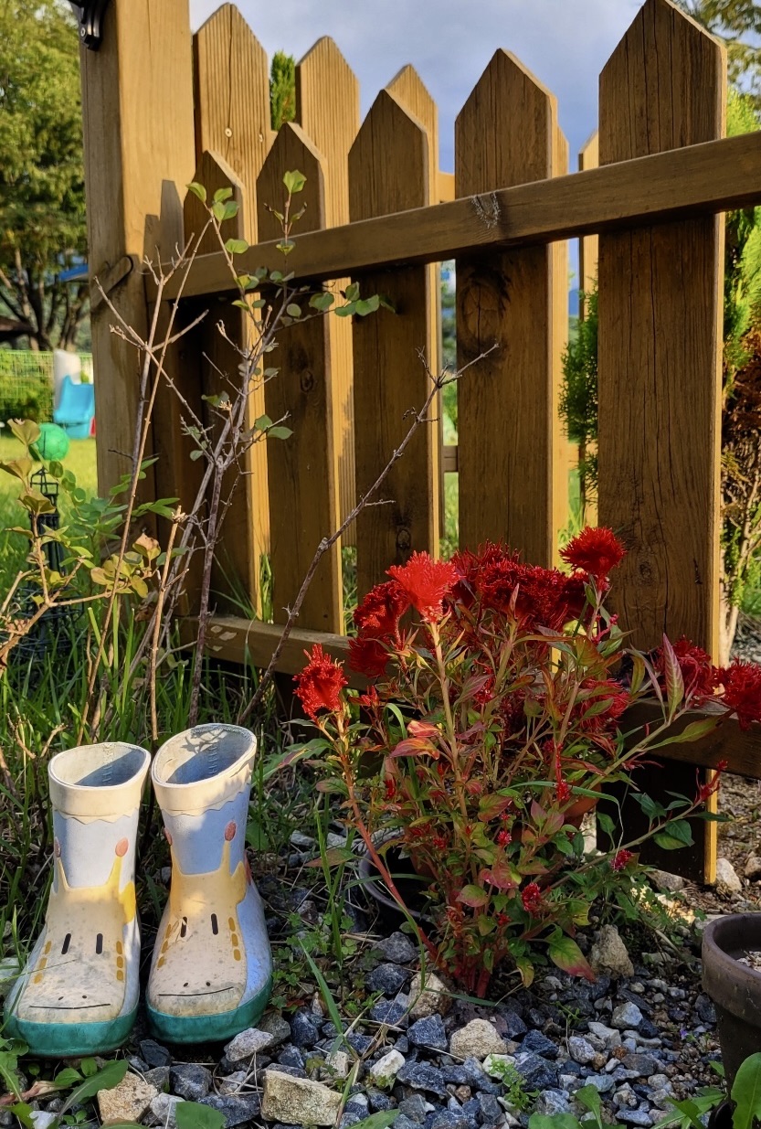 아이의 장화와 붉은 맨드라미.. 동심을 불러옵니다.