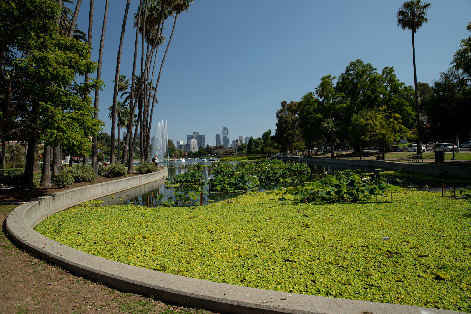 시원한 분수대와 함께 엘에이 다운타운이 보이는 그곳에는 숫자는 적지만 연꽃도 피어있습니다.