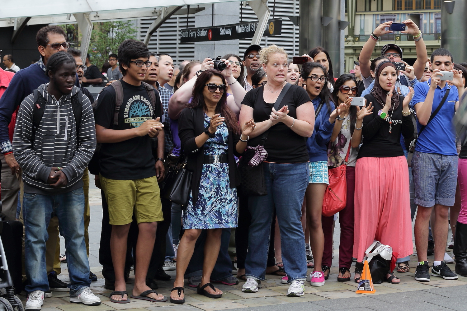 거리 공연을 관람하는 사람들의 표정입니다.