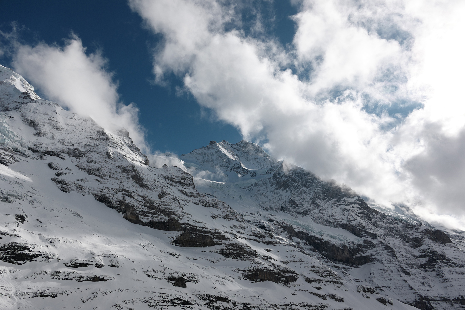 멀리 알프스정상의 운무와, 봉우라와 파란허늘이 잘 어울어진