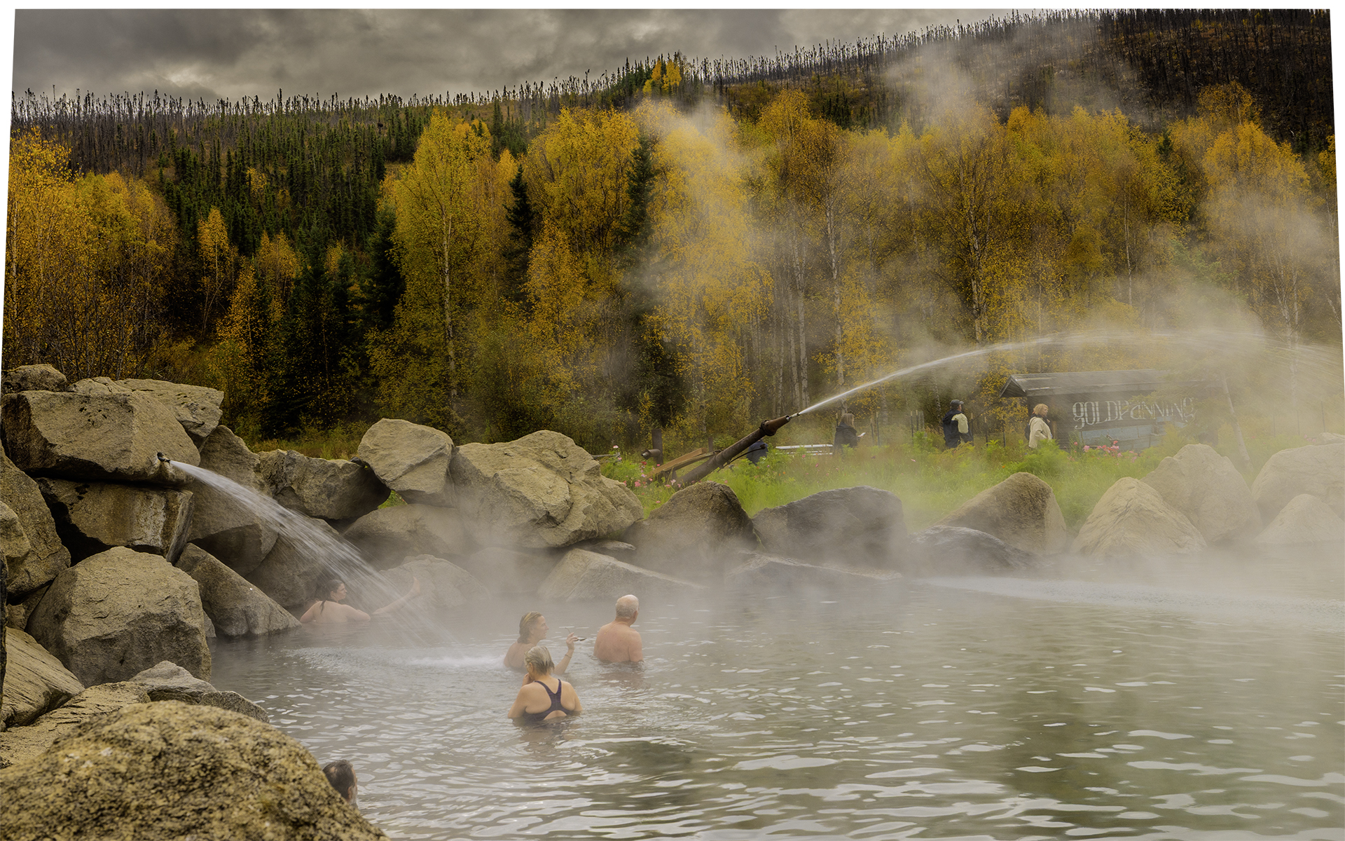 김이 모락모락 올라오는 야외 유황온천을
