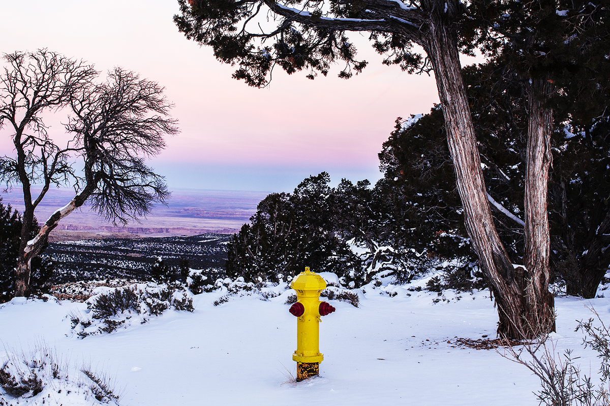 그렌드 케년에서 유난히 눈속에 노란색의 수화기가 황혼빛에 정겨워 보였습니다.