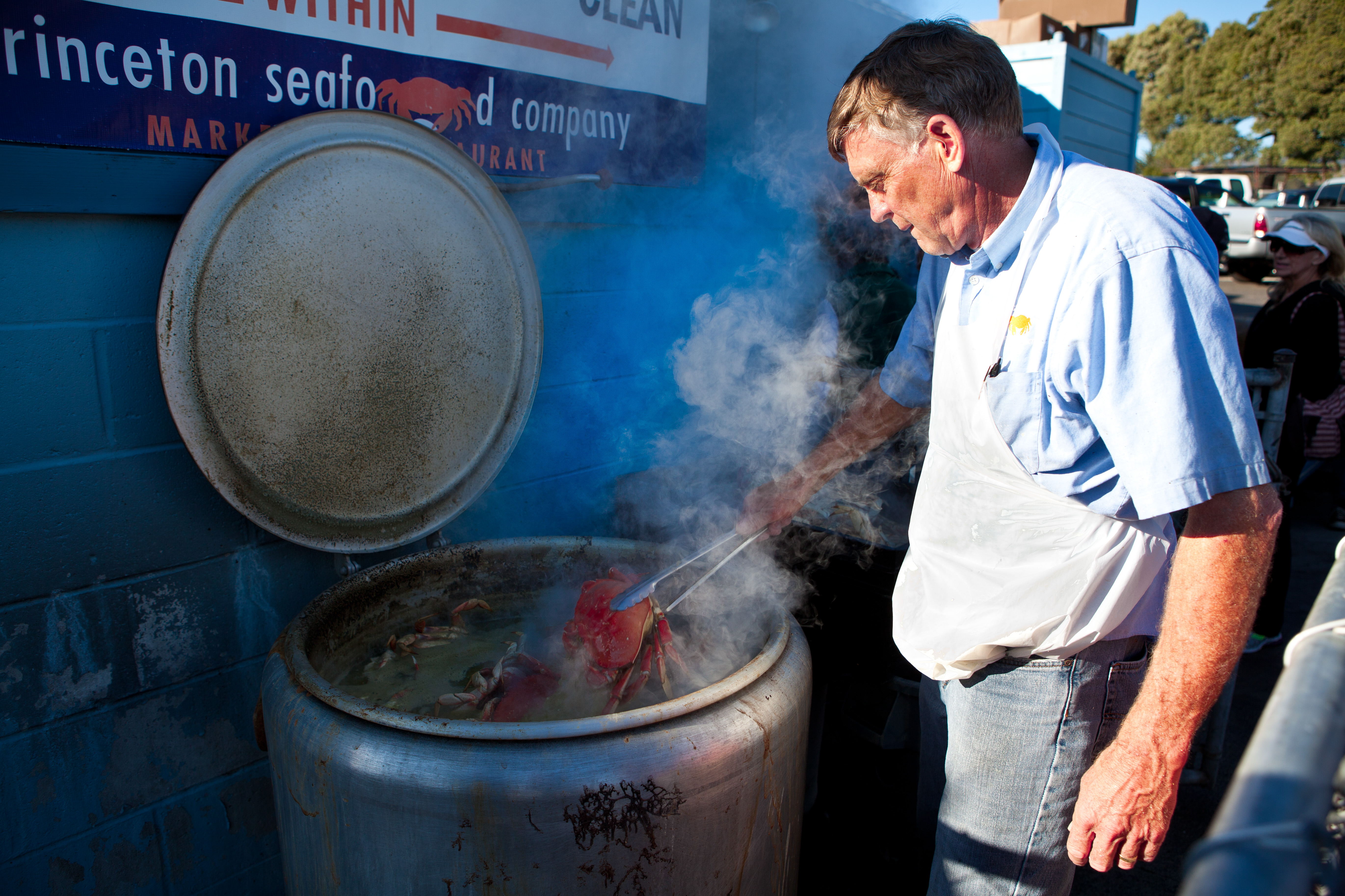 Half Moon Bay, CA 항구에서 광관객들에게 판매 하기 위해 Crab 요리를 요리 하고 있는 장면.