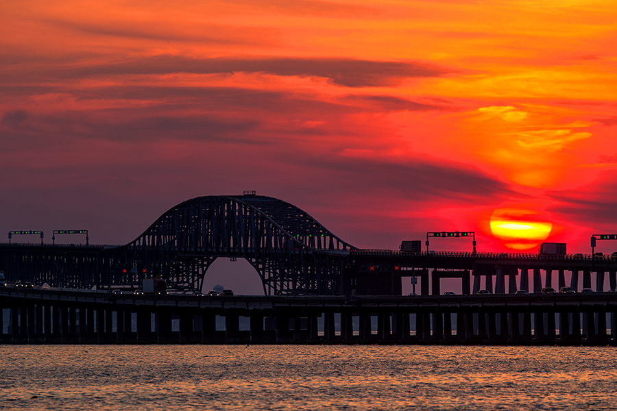 매릴랜드주의 유명한 베이 브릿지 너머로 해가 지고 있습니다