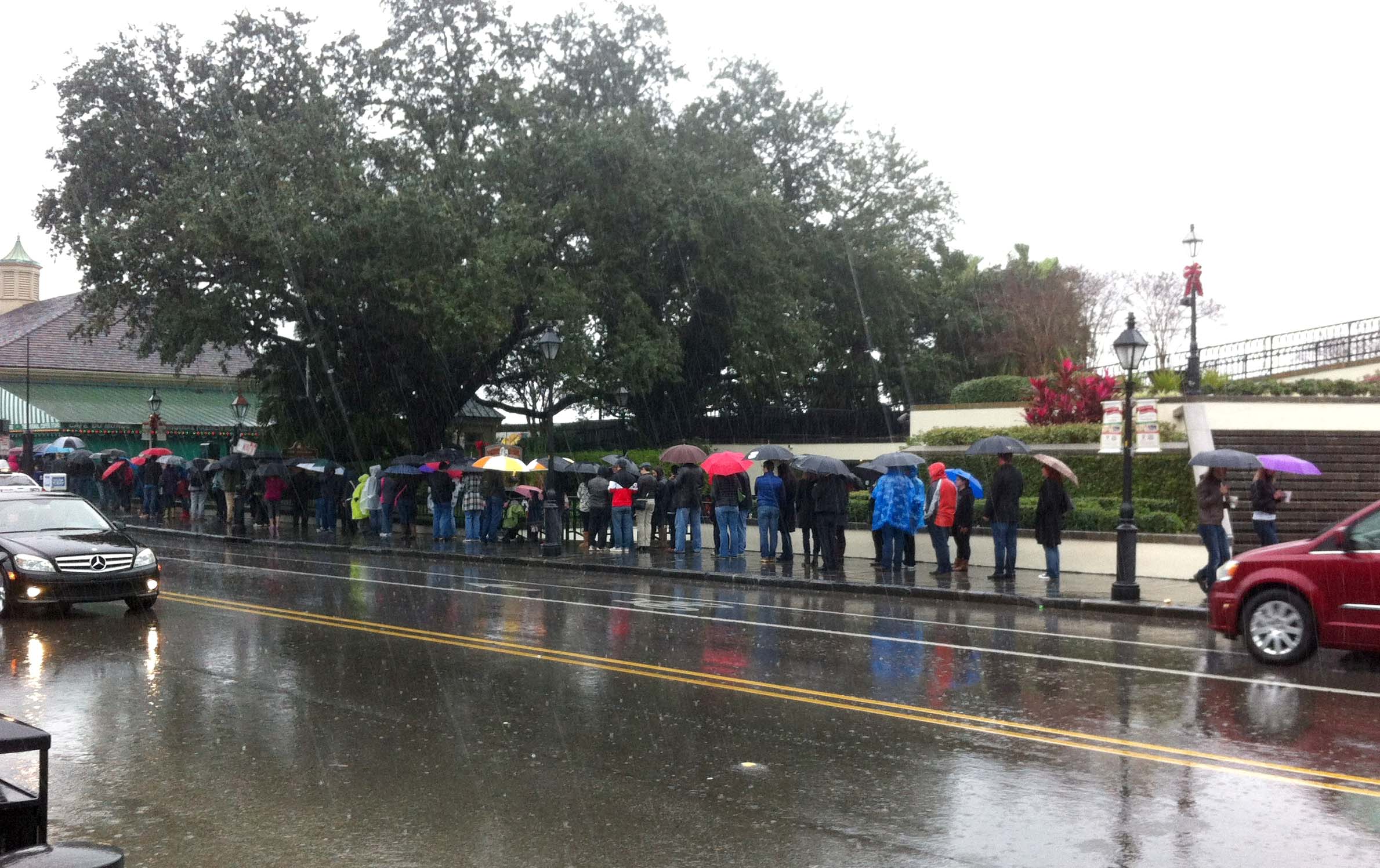 베니에를 먹어보기 위한 빗속의 행렬