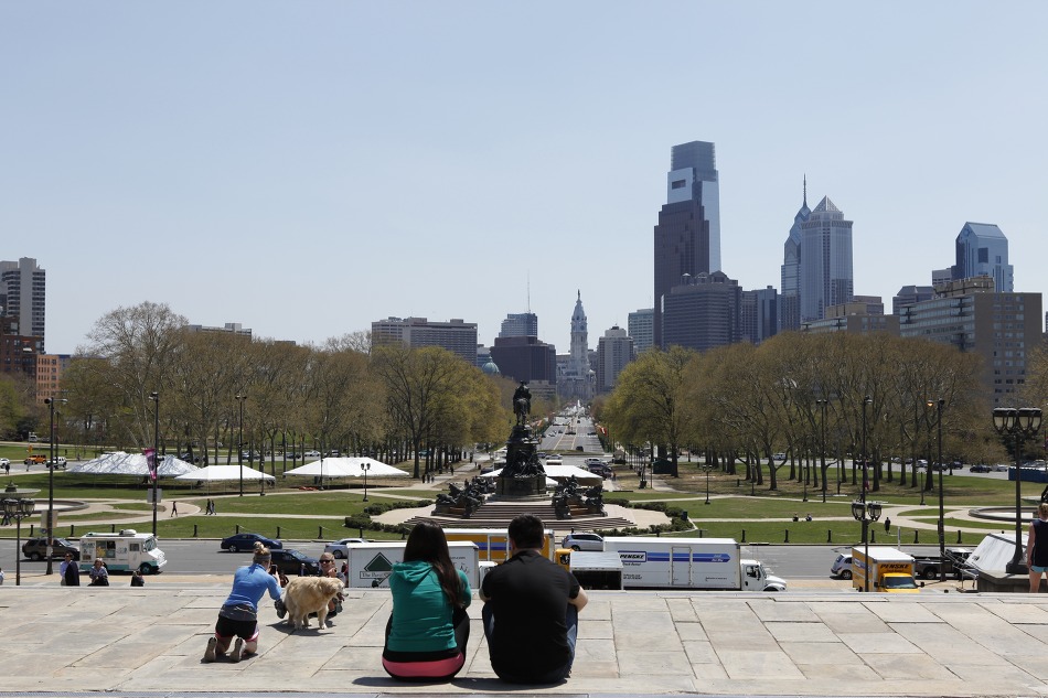 필라델피아 박물관 앞 계단에 나란히 앉아 바라보고 있는 연인..