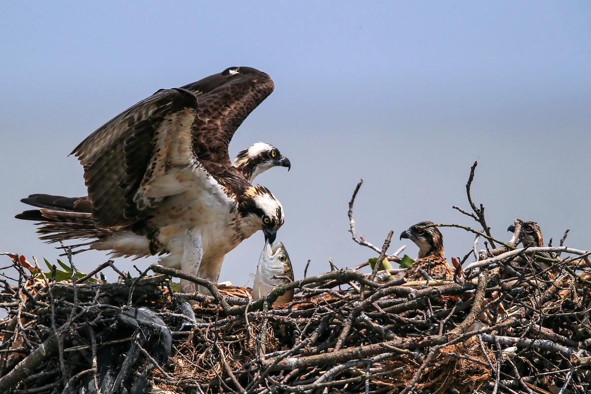 아빠가 큼직한 물고기를 잡아와서 엄마가 매우 기뻐합니다 온 식구가 포식하게 생겼습니다