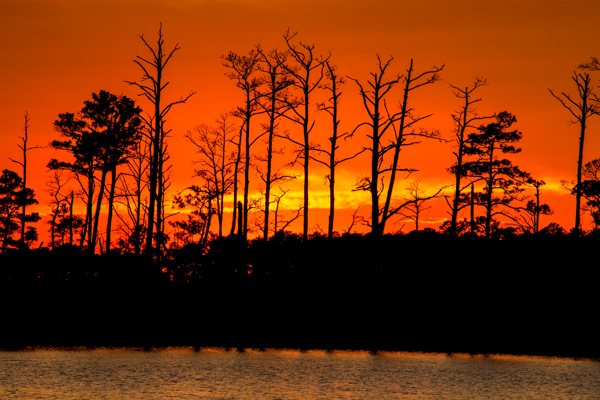 흰머리수리의 둥지가 있는 곳 너머로 해는 기울고 밤이 찾아 옵니다