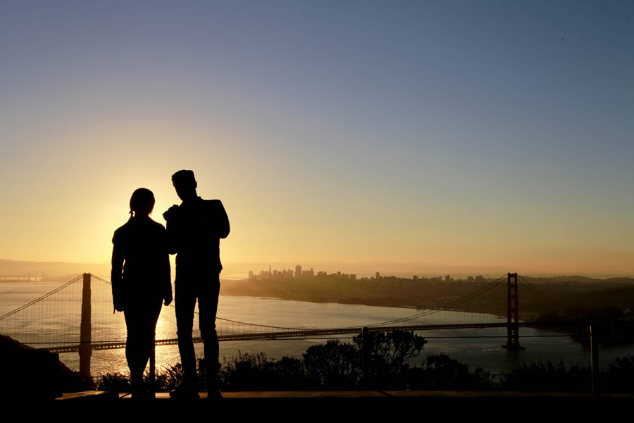 이른 아침에 Golden Gate Bridge를 바라보는 한쌍의 연인.