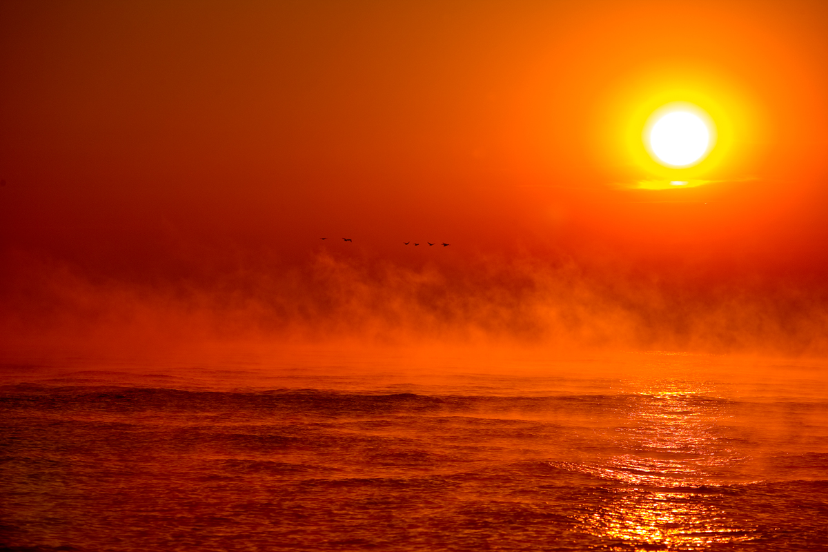 해무 속에서 아침해가 뜨자 물새들의 움직임도 빨라집니다