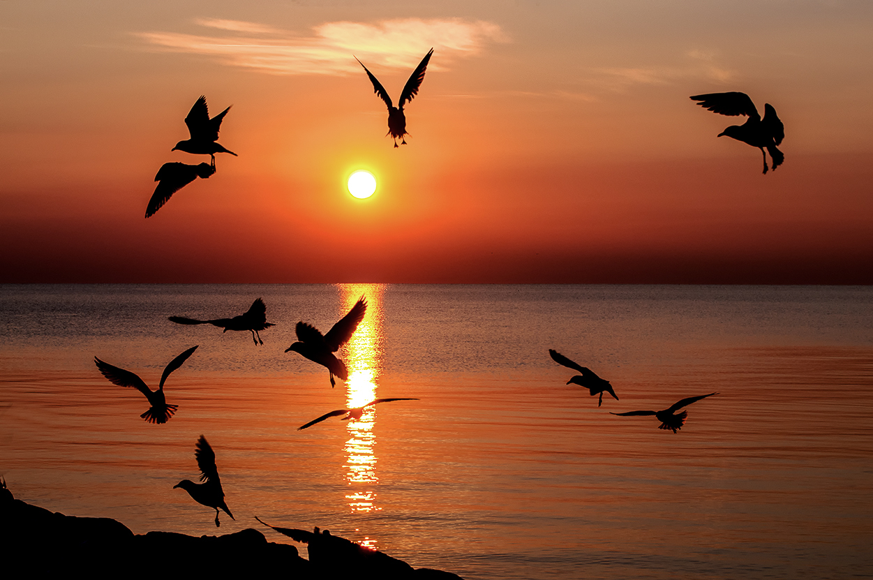 아침 해를 반기는 갈매기들
