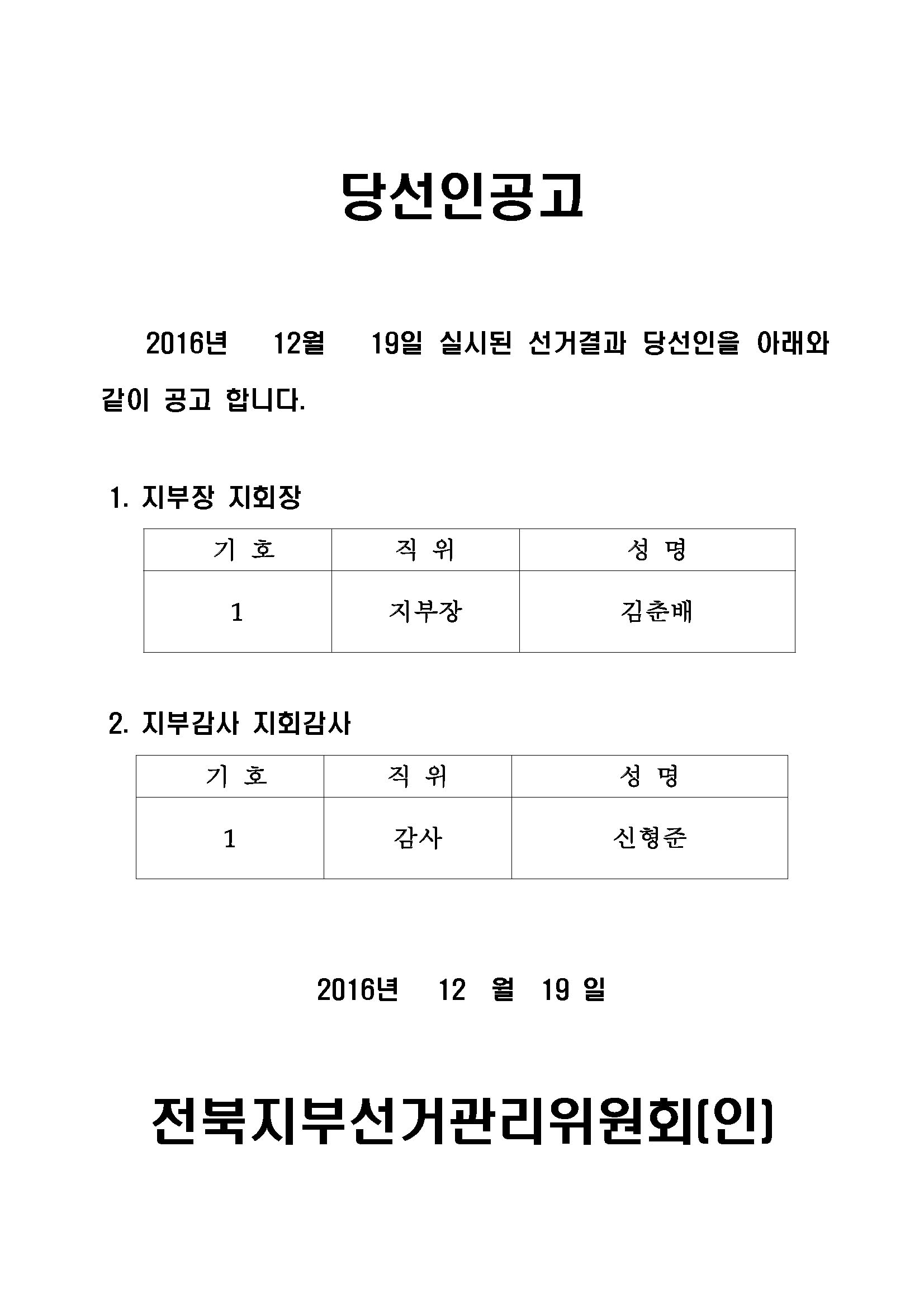 [선거공고] 제3기 전북지부장 및 감사 당선인 공고
