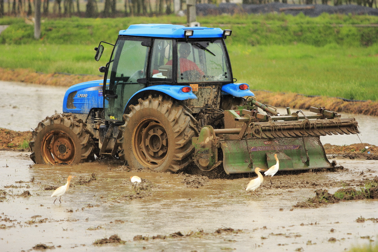 모내기 준비에 바쁜 트랙터와 달리 먹이를 찾고 있는 새들은 여유로웠습니다.