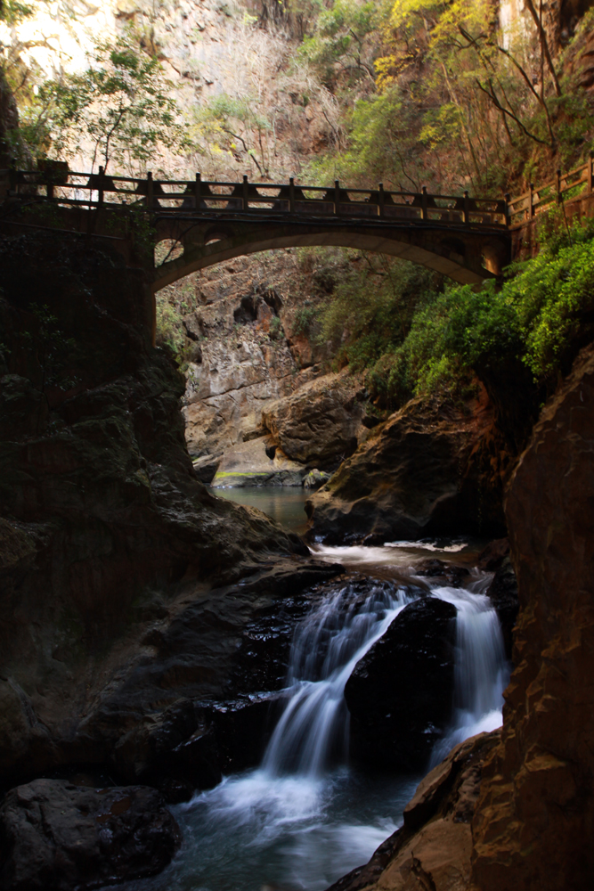 다리 밑으로 흐르는 작은 폭포