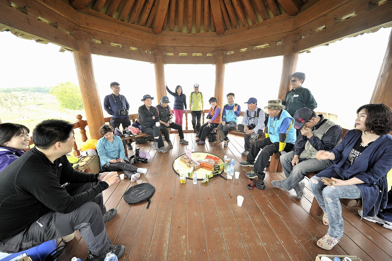 명당자리 정자에서 간식을 먹으며 담소를 나누고 즐거워 하는 모습...