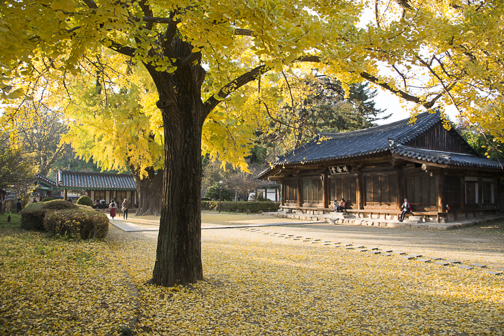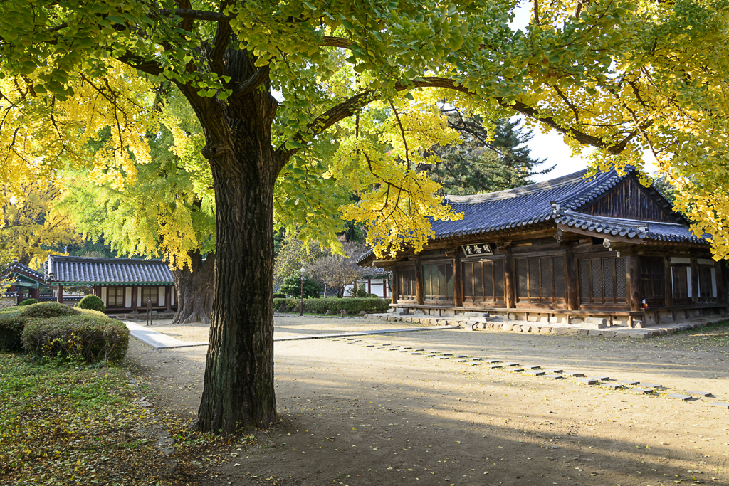 ■ 마음을 수양하는 곳 행단 행단의 어원은 공자께서 살구나무 아래 단에서 강학하였다는 옛일에 뿌리를 두고 있다. 행단은 살구나무가 있었던 제사 터 혹은 언덕을 지칭한다. 행단은 중국 산둥성 취푸(곡부)에 위치한 ‘공부’ 안에 있다. 살구나무를 우리나라에서는 은빛 살구인 은행나무로 심었다.은행나무를 심은 이유는 살구나무의 ‘행’과 은행의 ‘행’이 같고, 오래 살지 않는 살구나무보다 천 년 이상 살 수 있고 가을에 수확하면 경제적으로 도움이 되었기 때문이라는 설이 있다. 유교의 상징목이 은행나무이다. 선비의 올곧은 지조를 나타내는 것이기에서 양반가나 향교, 서원 등에는 반드시 심는 나무였다. 대부분 서원과 향교에는 오래된 은행나무가 있다. 오늘날에는 증산작용으로 독소를 영양분으로 바꾸는 놀라운 자연의 순화작용 때문에 은행나무를 가로수로 많이 심는다. 전주 구시가지에도 은행나무 가로수가 즐비하다. 집에서 가까워 늘 산책하는 한옥마을, 경기전과 전주 향교의 은행나무 열매가 가을 속에서 익어간다. 최근에는 관광지가 된 한옥마을에 외국인 관광객이 부쩍 늘었다. 하여 옛 선현들의 공부하는 집앞 마당에도 중국인 단체관광객들의 인증사진을 담는 소리가 요란하다.