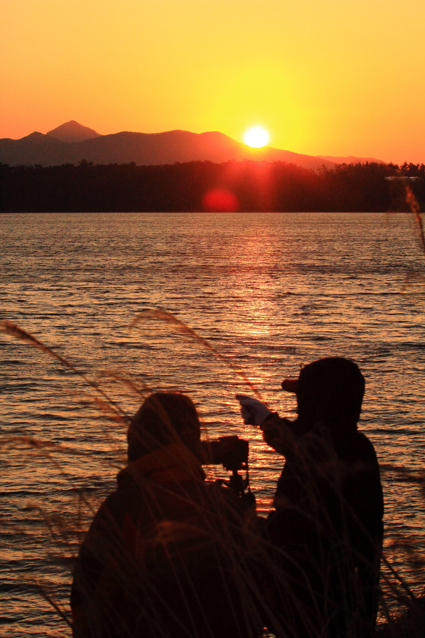 추위에 아랑곳하지 않고 가창오리 멋진 군무을 기다리는 아이와 엄마, 사진가님들.