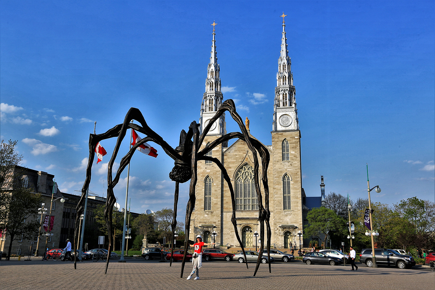 캐나다 국립 미술관 광장의 초대형 거미조형물과 뒤로 보이는  바실리카 대성당(Notre Dame Cathedral Basilica)