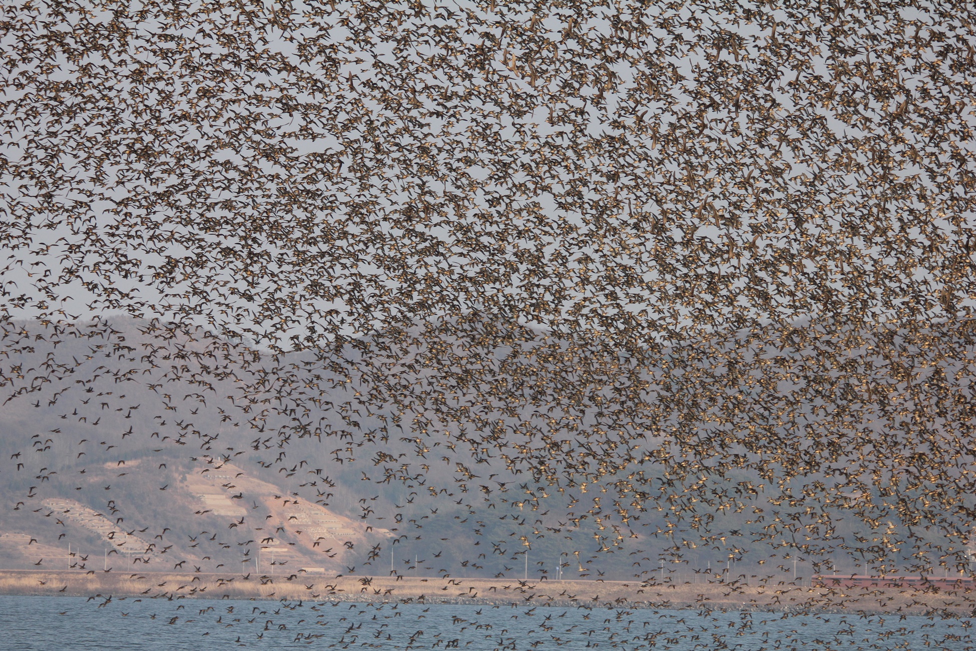 4~50만 마리 가창오리때가 한꺼번에 날아 올라서 밤새 먹이활동 을 하려고 한꺼번에 출동 하기위헤 금강 상공을