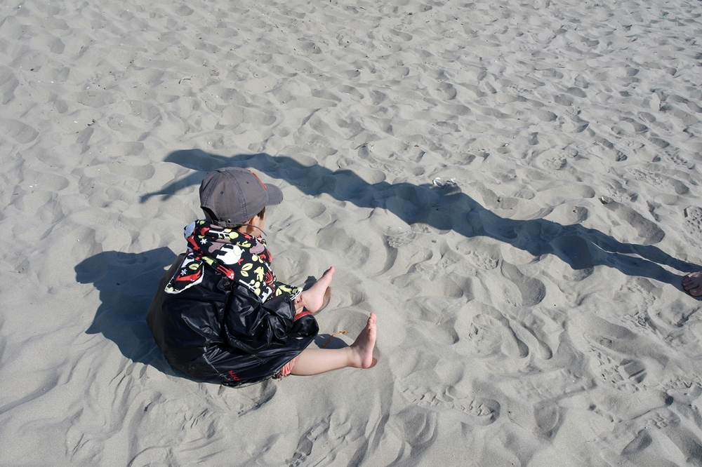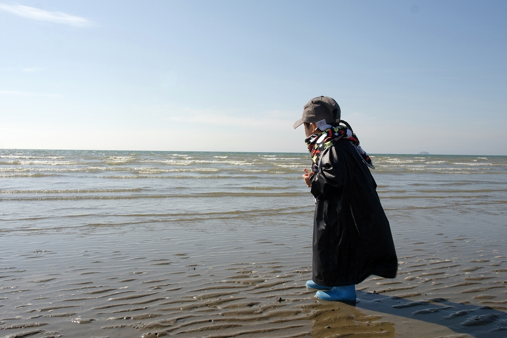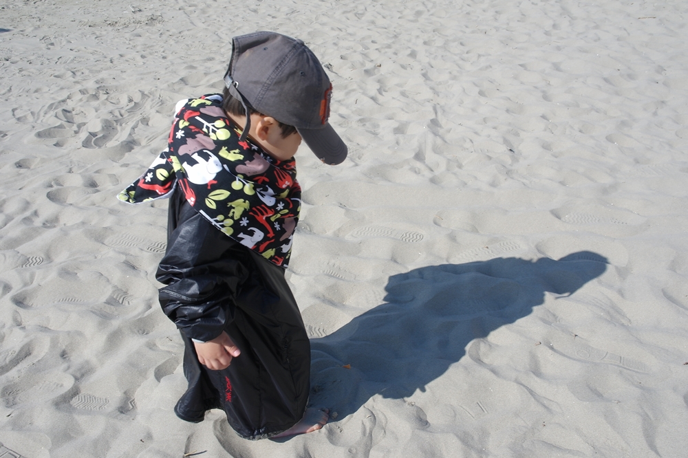 잠바를벗어 손자에게입혀 모래 사장으로 들어간다