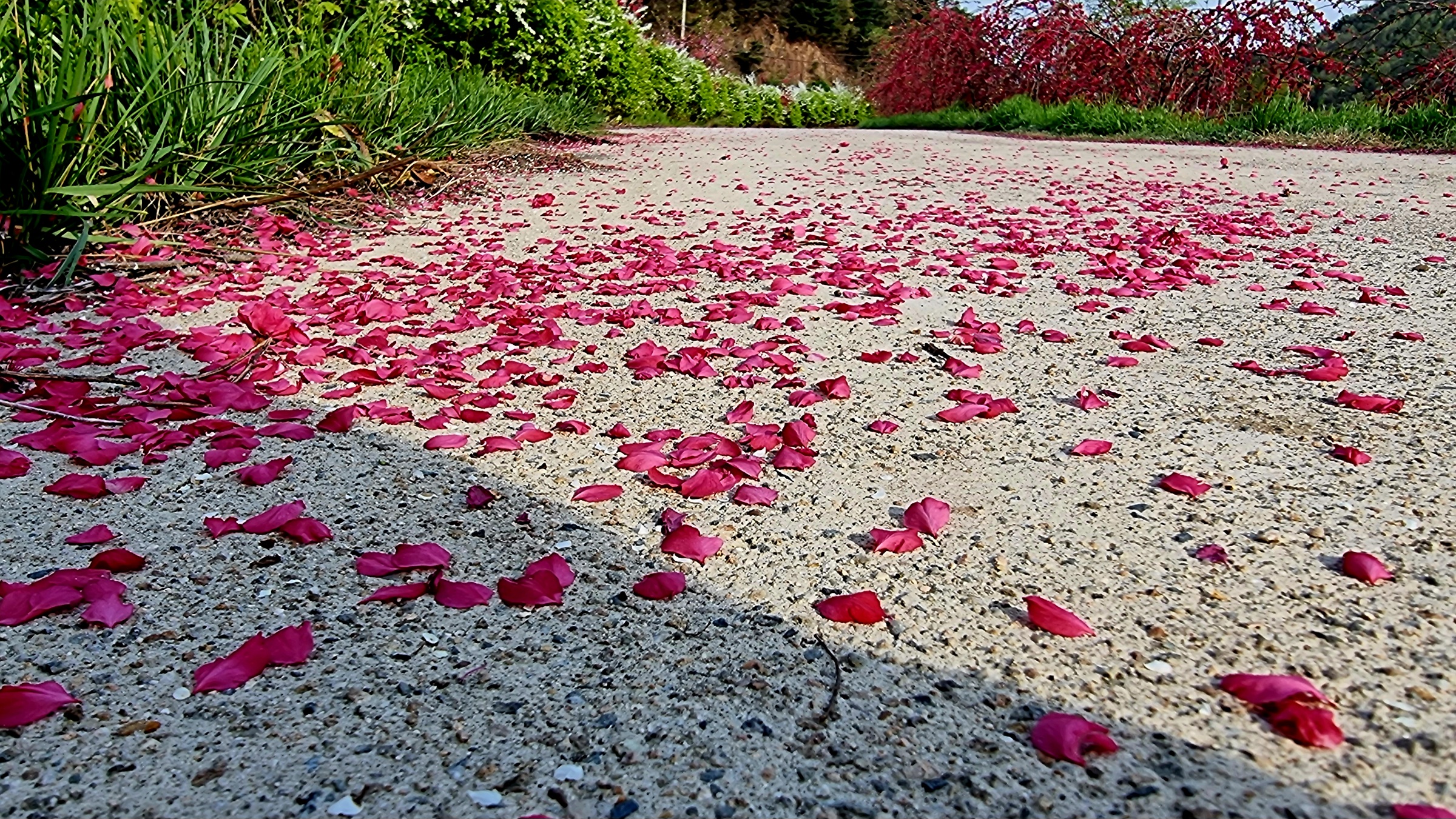 꽃잎으로 장식된 시골길 도로