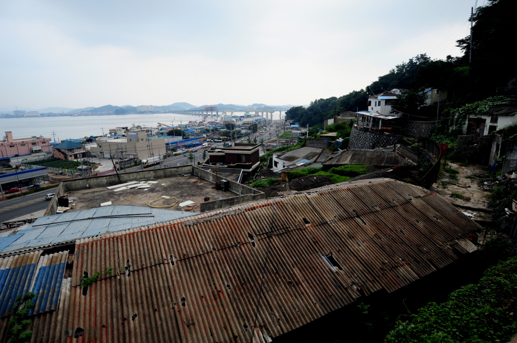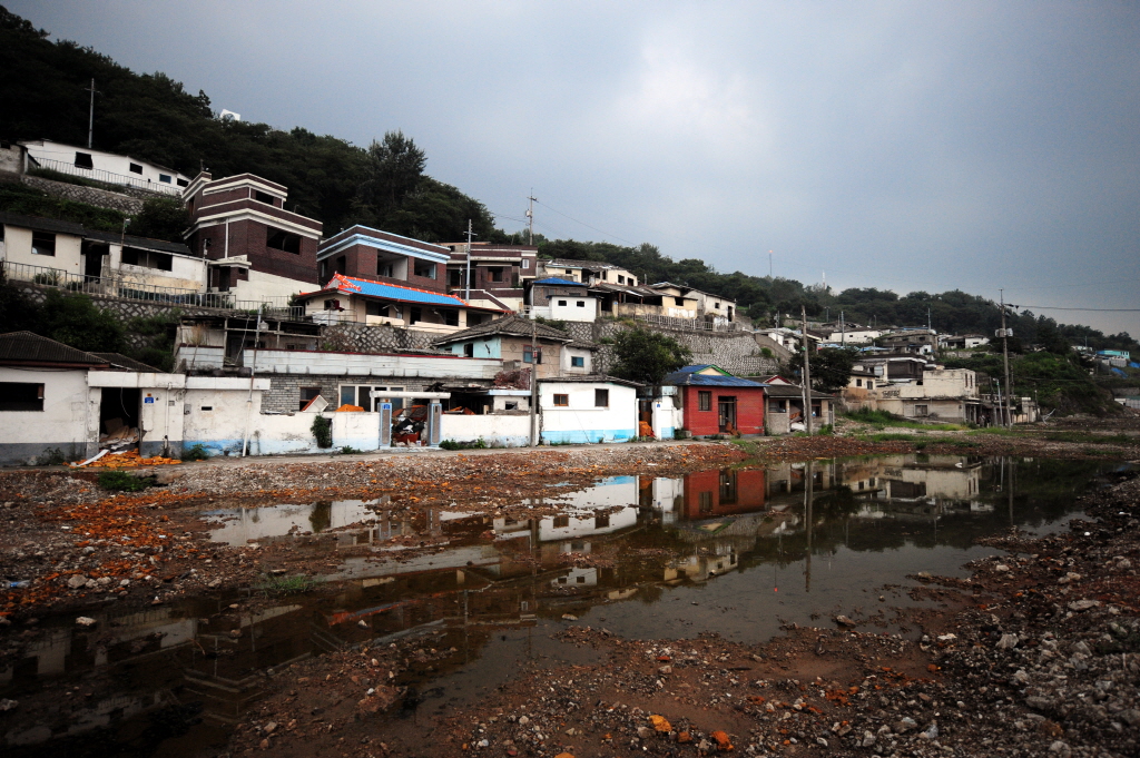 해망동에서 내려와 공터의 빗물에 반영된 해망동 철거촌....반대편의 대로와 새로 지어진 건물이 대조적이다.