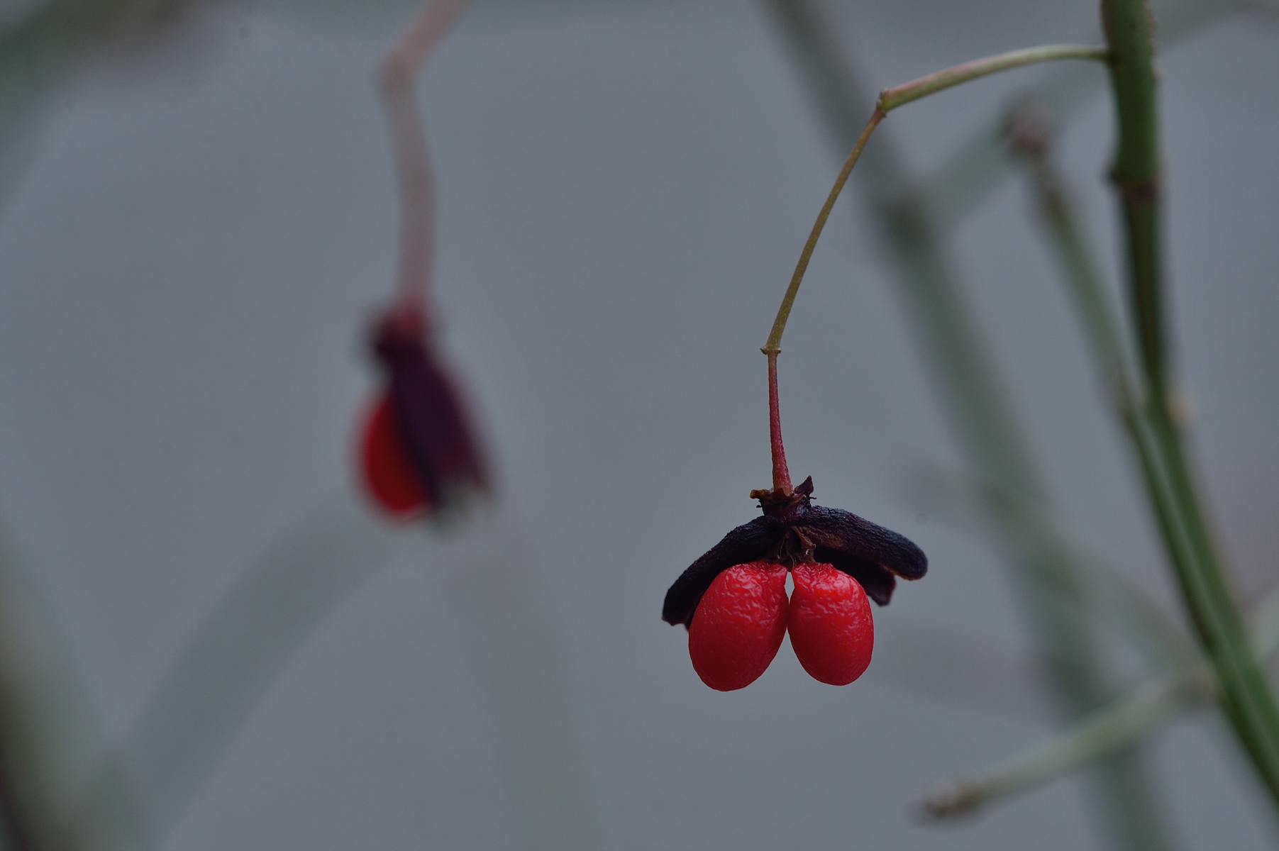 늦가을 오후의 빛이 숨어버린 나무가지 사이에 붉은 열매 .화살나무의 씨앗.한해도 잘 마무리 하여 얻어진 열매.힘든계절을 이겨내고 작지만 자기의 무언가를 남기며 화살나무는 긴 겨울에 들어갈 준비를 한듯 가지에는 나뭇잎 하나가 없다.