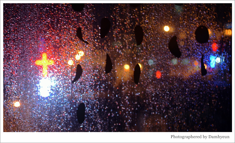 갑자기 집에 정전이 되면서 창문 밖 풍경이 비친 유리창에 흘러내린 빗방울이 이뻐서 한컷