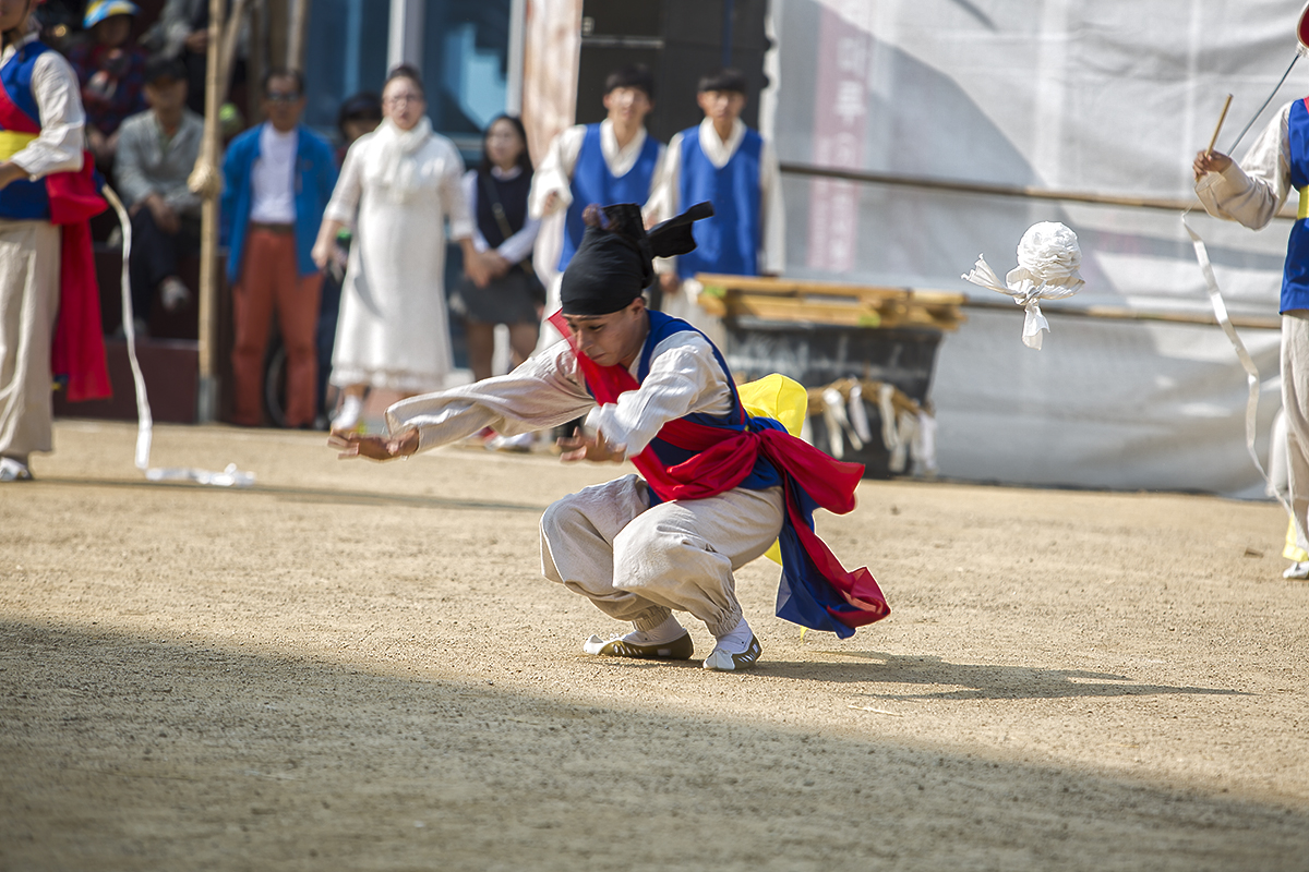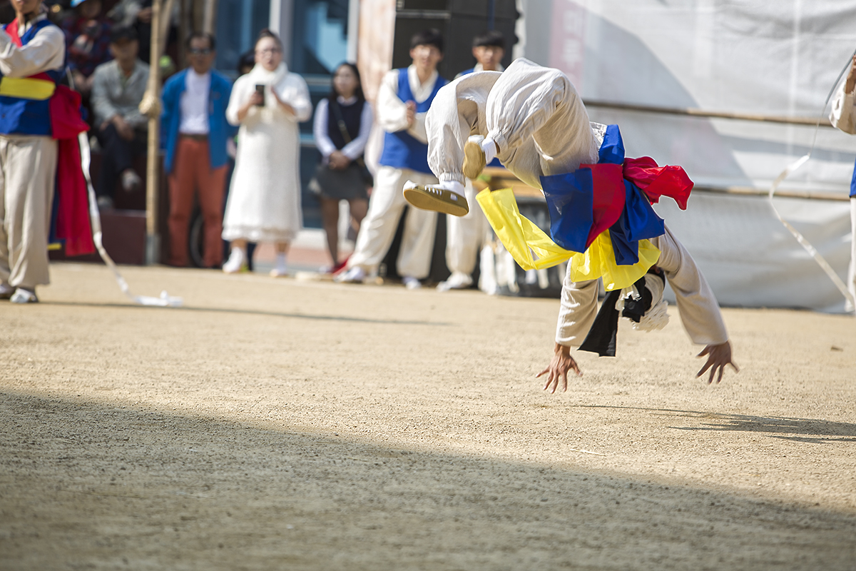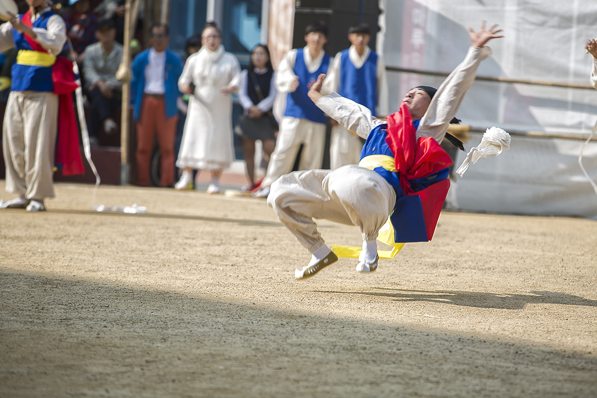 머리에 두른 꽃 리본이 벗겨저 날아가도록 공중제비를 돌고 있다
