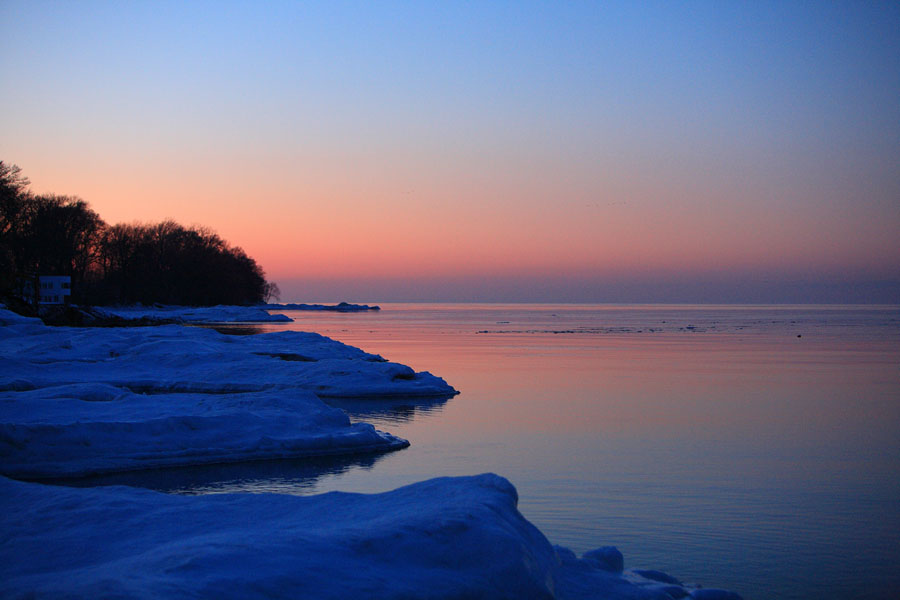 꽁꽁 얼어붙은 겨울강가에도 노을은 아름답게 그려져 있습니다.