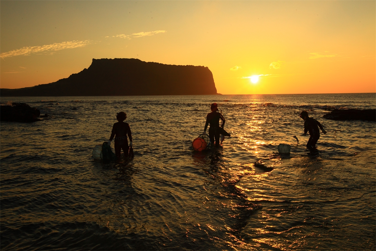 성산포 앞 바다에서 해녀들의 물질하는 모습