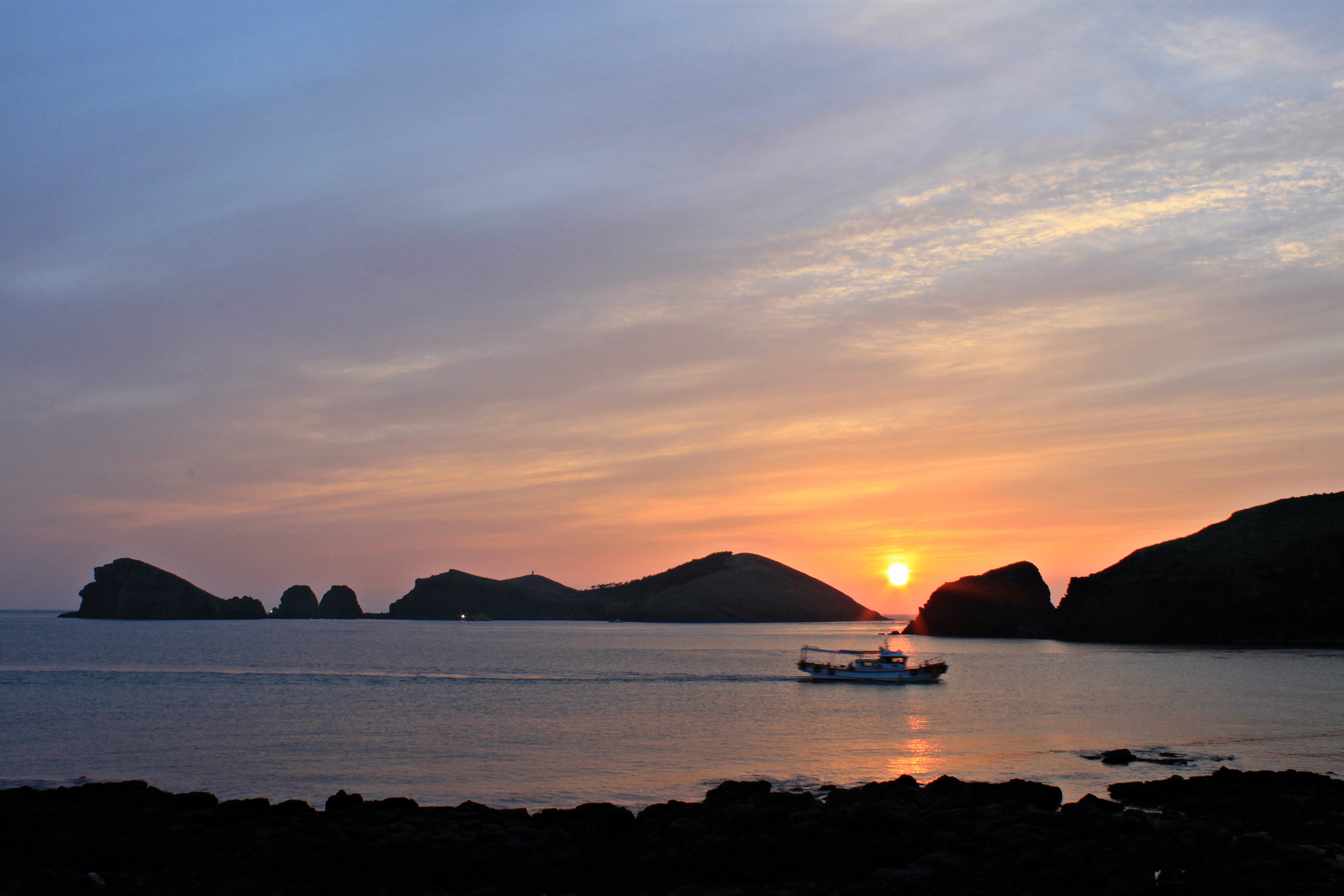 제주도 고산리 차귀도의 노을과 어선의 귀향