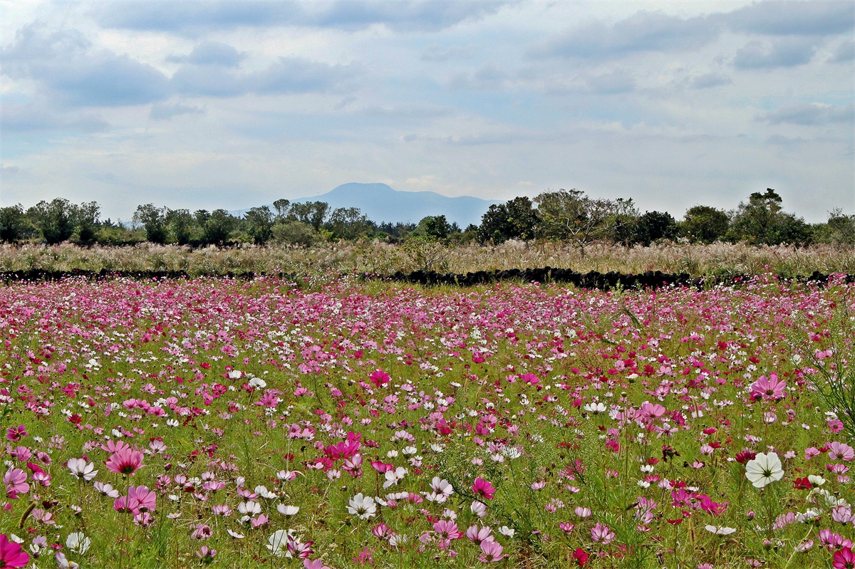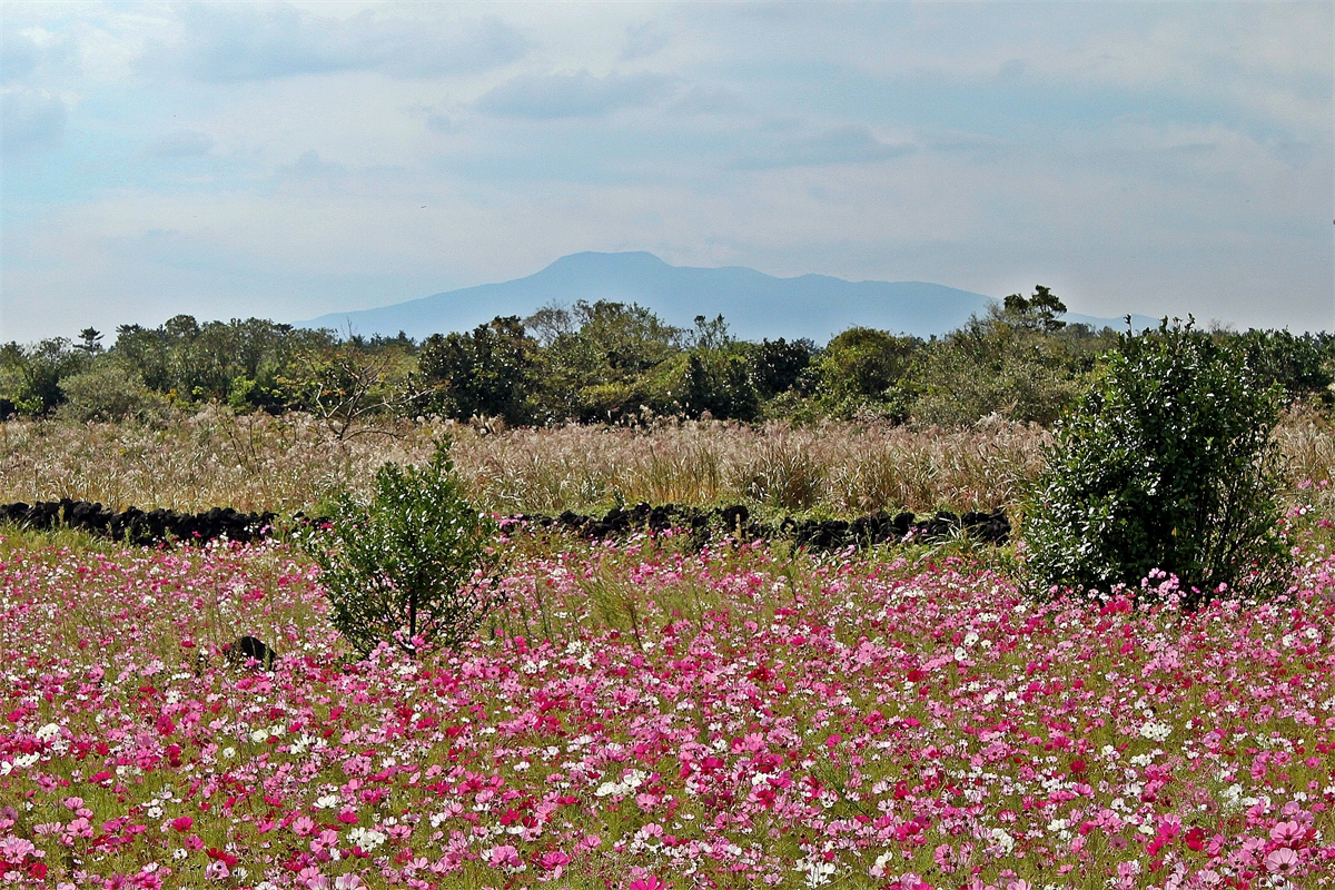 한라산이 멀리 보이고 억새,코스모스가 만발한 제주풍경,