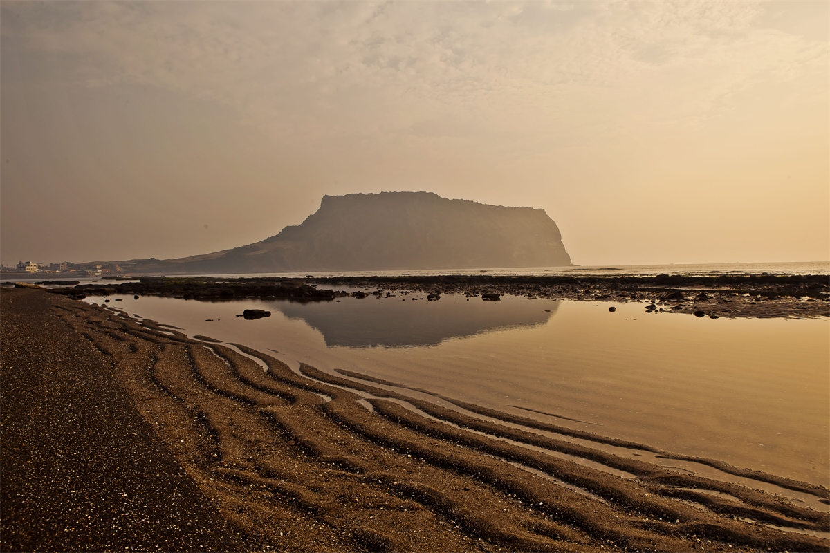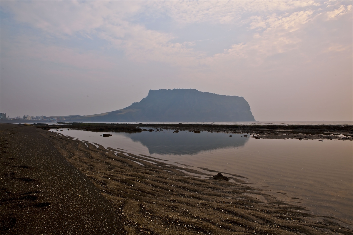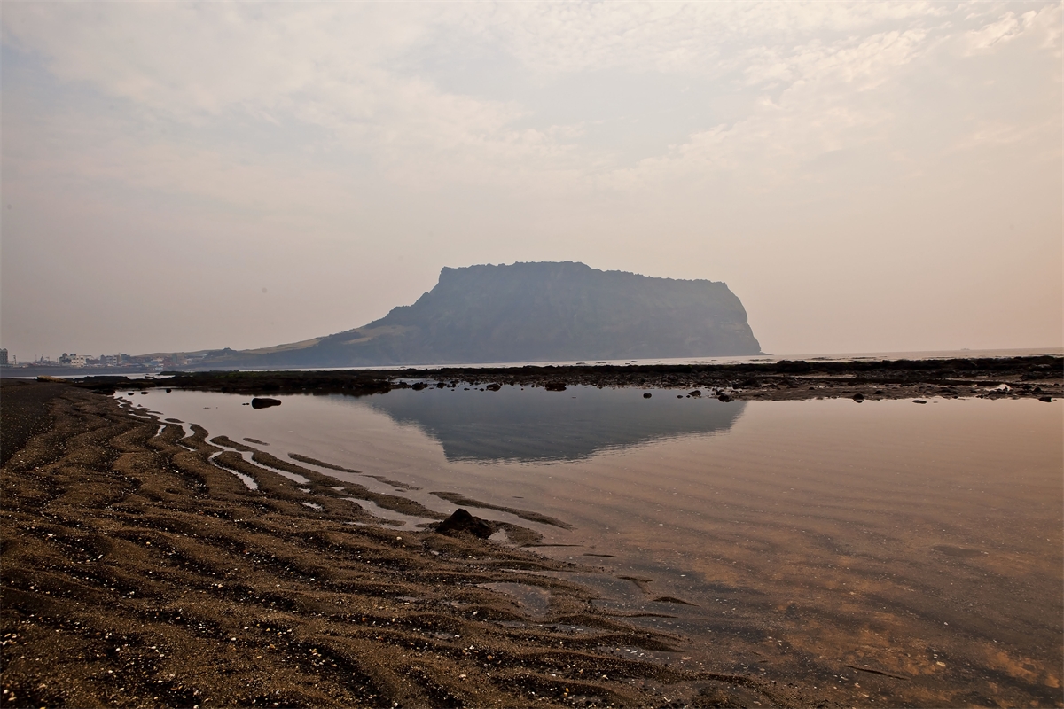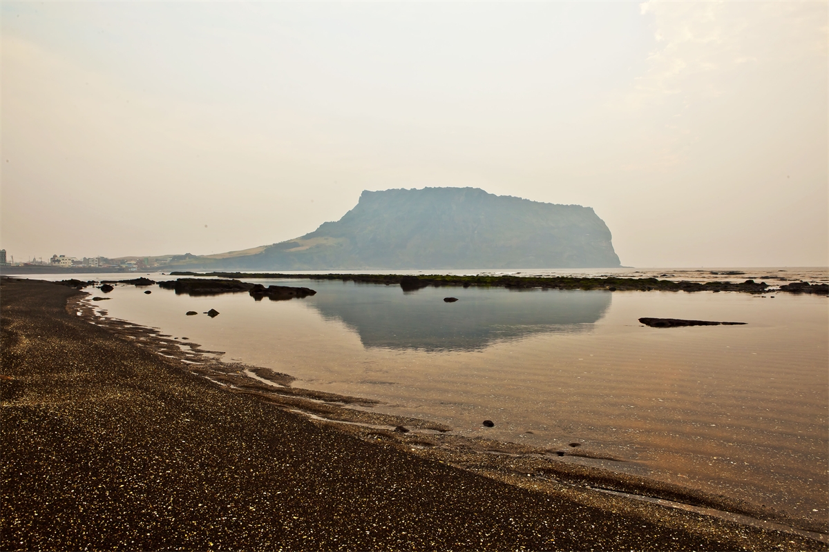 제주도 광치기 해안에서 바다에 비친 성산일출봉 반영