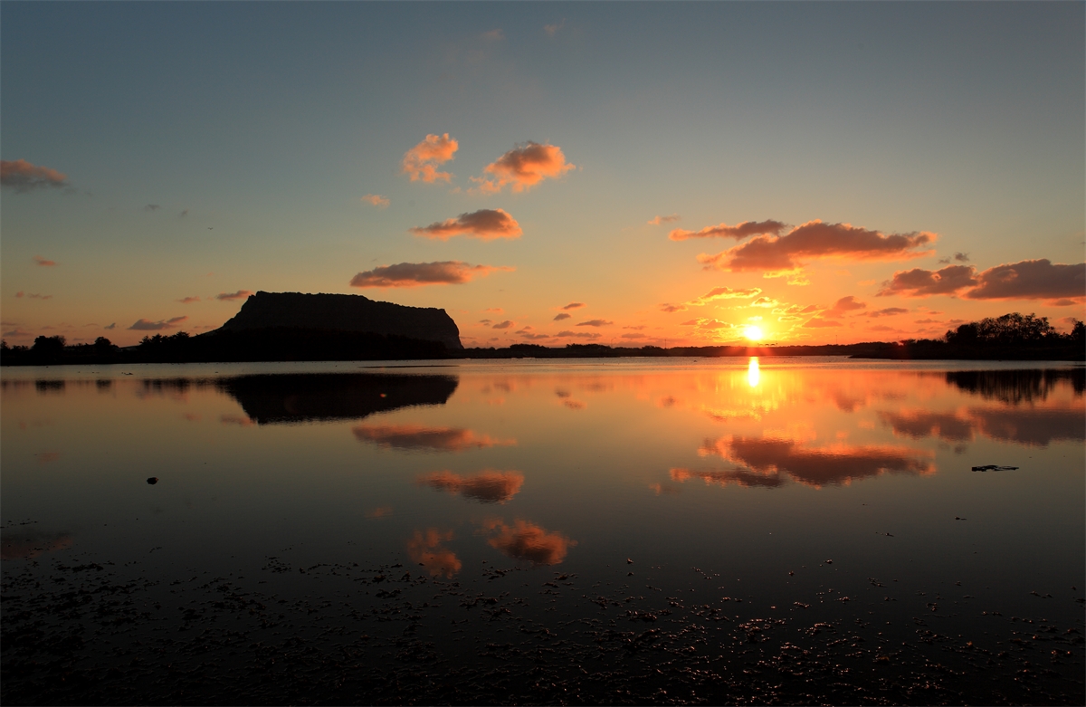 제주도 성산일출봉이 보이는 해안에서 일출을 바라보며.