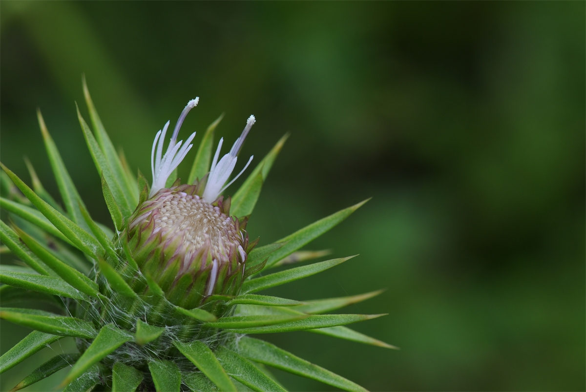 막 피어나는 흰색 엉컹퀴입니다.