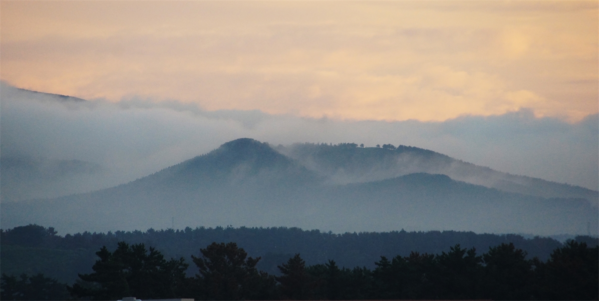 해가 스치고 간 제주 오름에 안개가 내린 모습입니다.