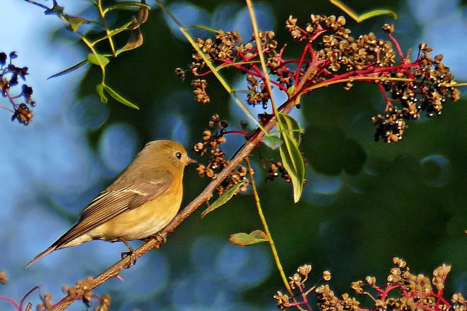 산초나무 열매 맛집을 탐방하여 식사중인 노랑딱새 암컷 ....