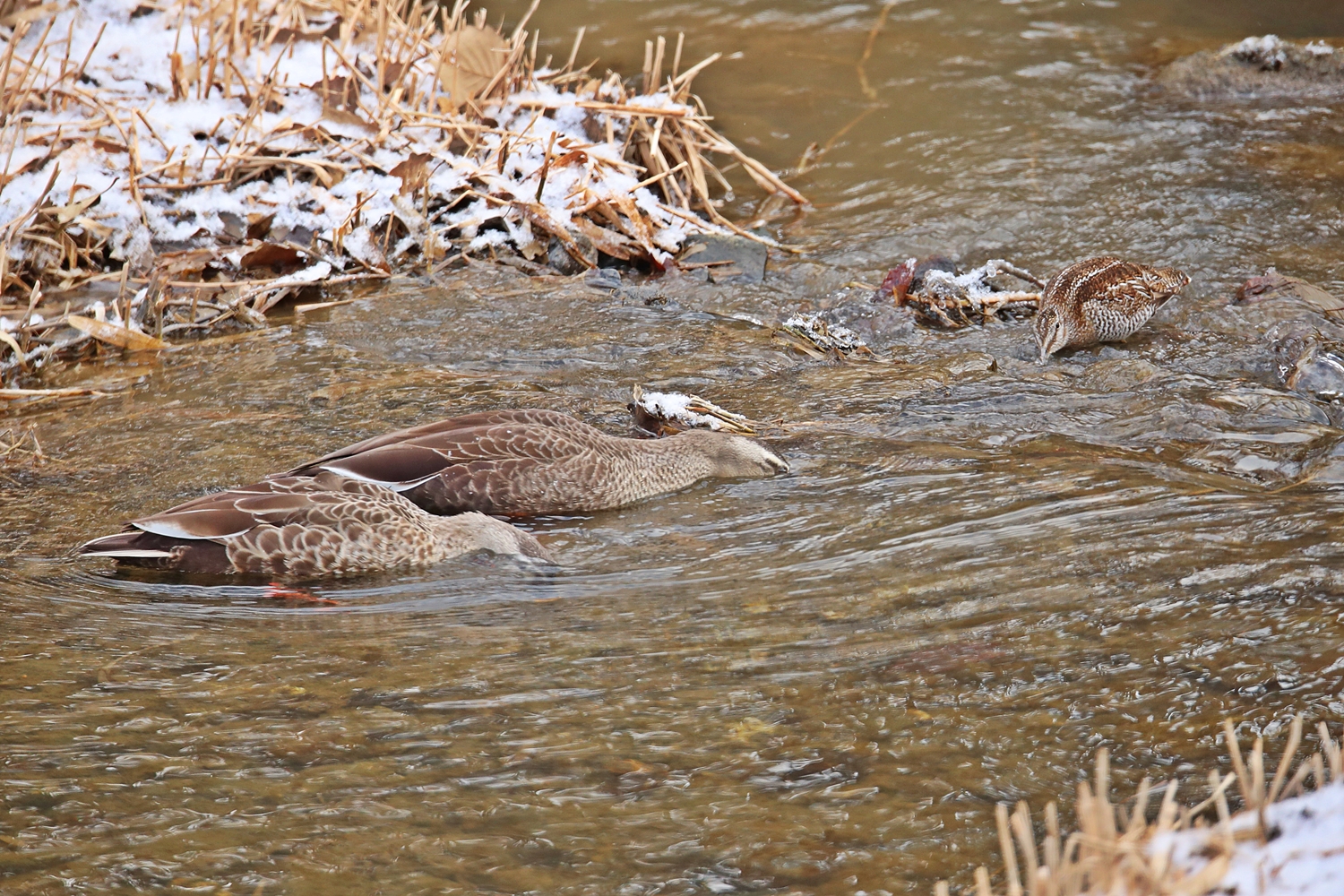 다정하게 먹이활동하는 청도요와 흰뺨검둥오리 ....