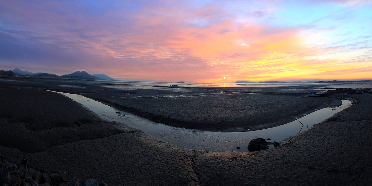 호동리의 갯벌에 아침 해가 갯골과 어울리어 솟아 오릅니다.