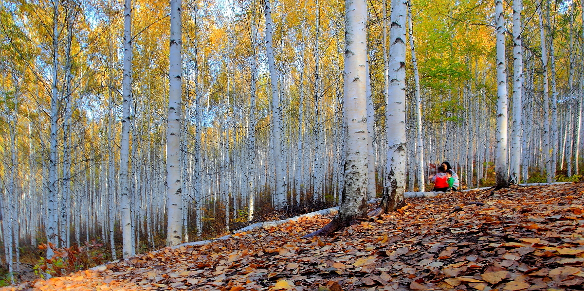 자작나무 숲에서 가족이 오래도록 즐거운 대화 시간을 갖습니다.
