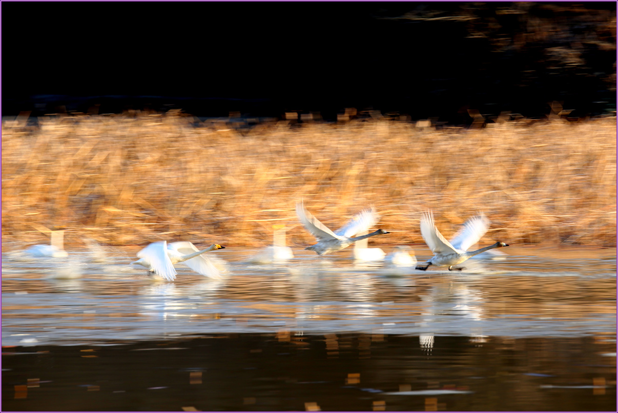 소담한 호수에서 편안한 밤을 보내고 어디론가 고니가족 비행을 서두른다.
